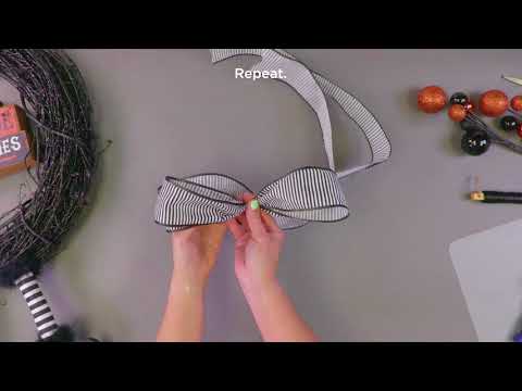 | Show off your spooky spirit with this adorable Halloween pick wreath! It’s the cutest way to greet the ghosts and ghouls who stop by your door. Take a look at our instructions below and we’ll show you how to easy it is to make your own with your favorite picks, ornaments and ribbon! Step 1 First, wire a décor sign into your grapevine wreath. Here’s how to do this: Wrap wire around the base of your witch hat a couple of times, pulling it taut as you wrap. Twist the wire at the back of the sign to hold it in place. Balance the sign on the inside bottom of the wreath. As you do this, pull the wire up to the top of the wreath and twist it to hold it in place. TIP: To make sure your sign won’t budge, you can also add a dab of hot glue. Step 2 Next, you’ll make an oversized bow to decorate the bottom of your wreath. Just follow these steps: Cut a piece of ribbon that’s about 60" long. Find the center of this length, make two large loops on either side, then pinch the center to hold it all in place. Leave tails that are each about 8" long on either side of the center. Wrap wire around the center to hold the bow, to secure, then wire it onto the bottom of your wreath, underneath the sign. Step 3 Now, push the witches’ legs pick into the grapevine wreath and trim the excess pick that extends past, into the center of the wreath. Use another dab of hot glue to make sure it stays in place. Step 4 Snip the individual balls from the ornamental ball pick, then use hot glue to glue them around the rest of the wreath, alternating orange and black. Step 5 To finish, just trim the stem from the mini pumpkin pick, then push it into the grapevine wreath, so it covers the center of your bow. |