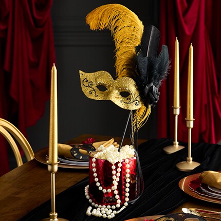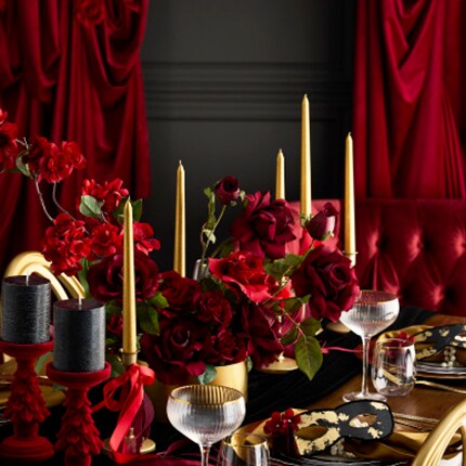 Incorporate deep red accents with black and gold staples. Mix home decor, ribbon and candles to curate a statement tablescape.