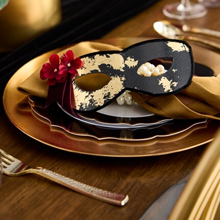Guests will be singing praises of your carefully curated table. Black and gold tableware pair perfectly for a classic affair.