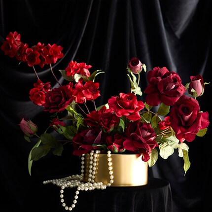 Faux florals ensure your arrangements last until curtain call. For an organic look, mix different shades and shapes of red flowers. Use floral foam to vary stem heights so the container's filled at different levels.