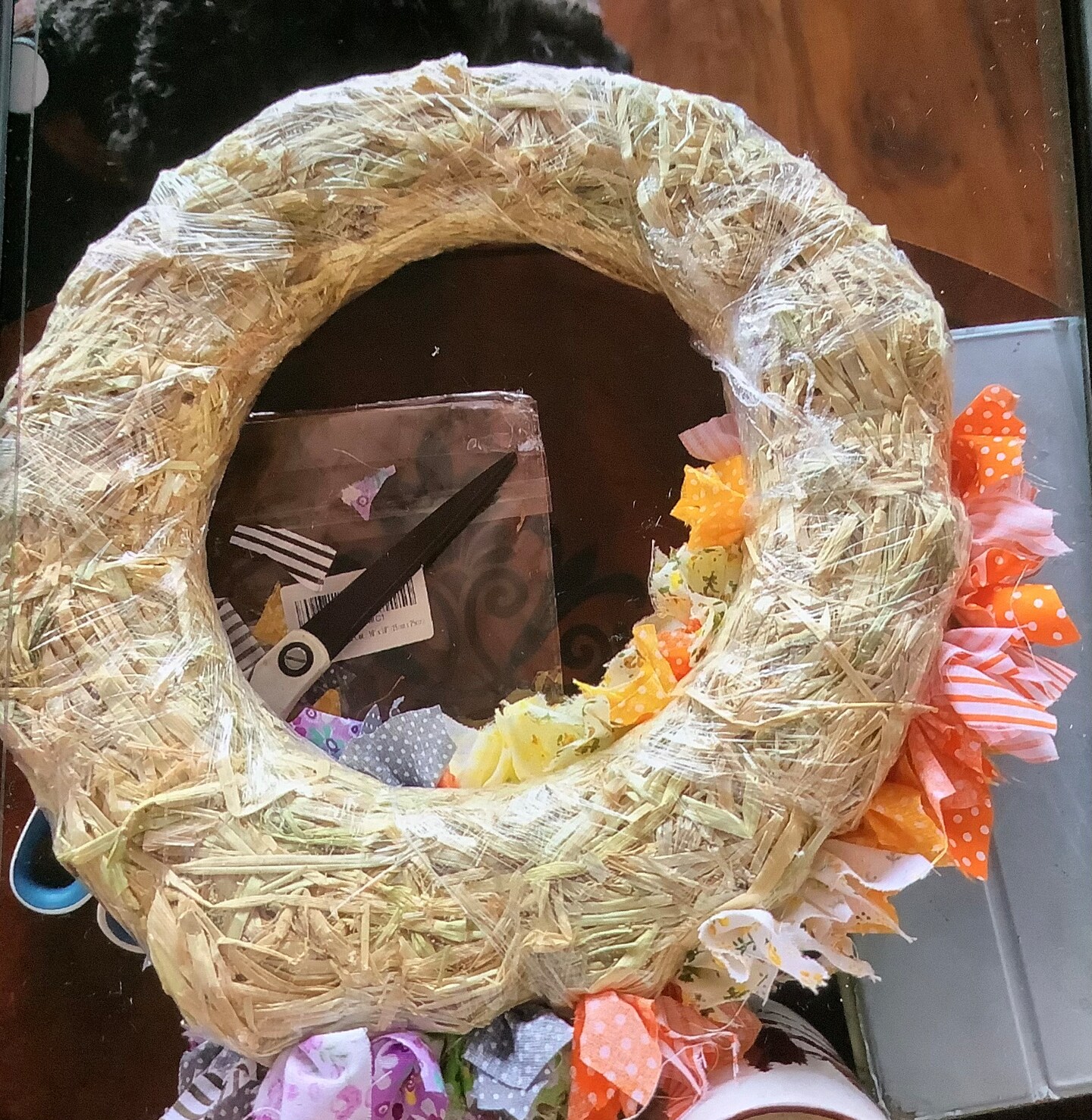 This craft has been around for quite sometime. Straw wreaths come in 10”, 12”, and 14” sizes and larger. I like using the 12” size. These decorative wreaths are easy to create. I make seasonal wreaths, using 4 inch squares of cloth in seasonal colors. You will be punching the cloth squares into the front and sides of your wreath with a pointed tool. I use the pointed side of a scissors. The pattern of the cloth squares is up to you. I like a combination of flowery cloth squares, then decorate.