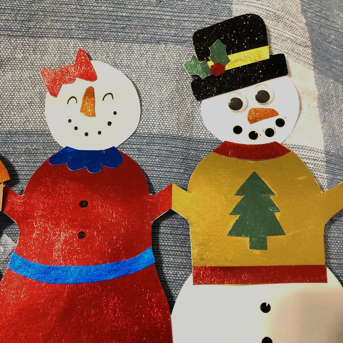 The perfect gift for a favorite family member - a snowman chain that you can dress up like old fashioned paper dolls. What makes it a great gift is it has a template to help you cut out a photo of someone special or of a precious pet. You can add a warm message as well as the many decorations you decide to dress your snow people up in. We used foil cardstock paper, but construction paper works very well. Also, we used faux black rhinestones, but a marker is far easier to create the face and coal buttons.