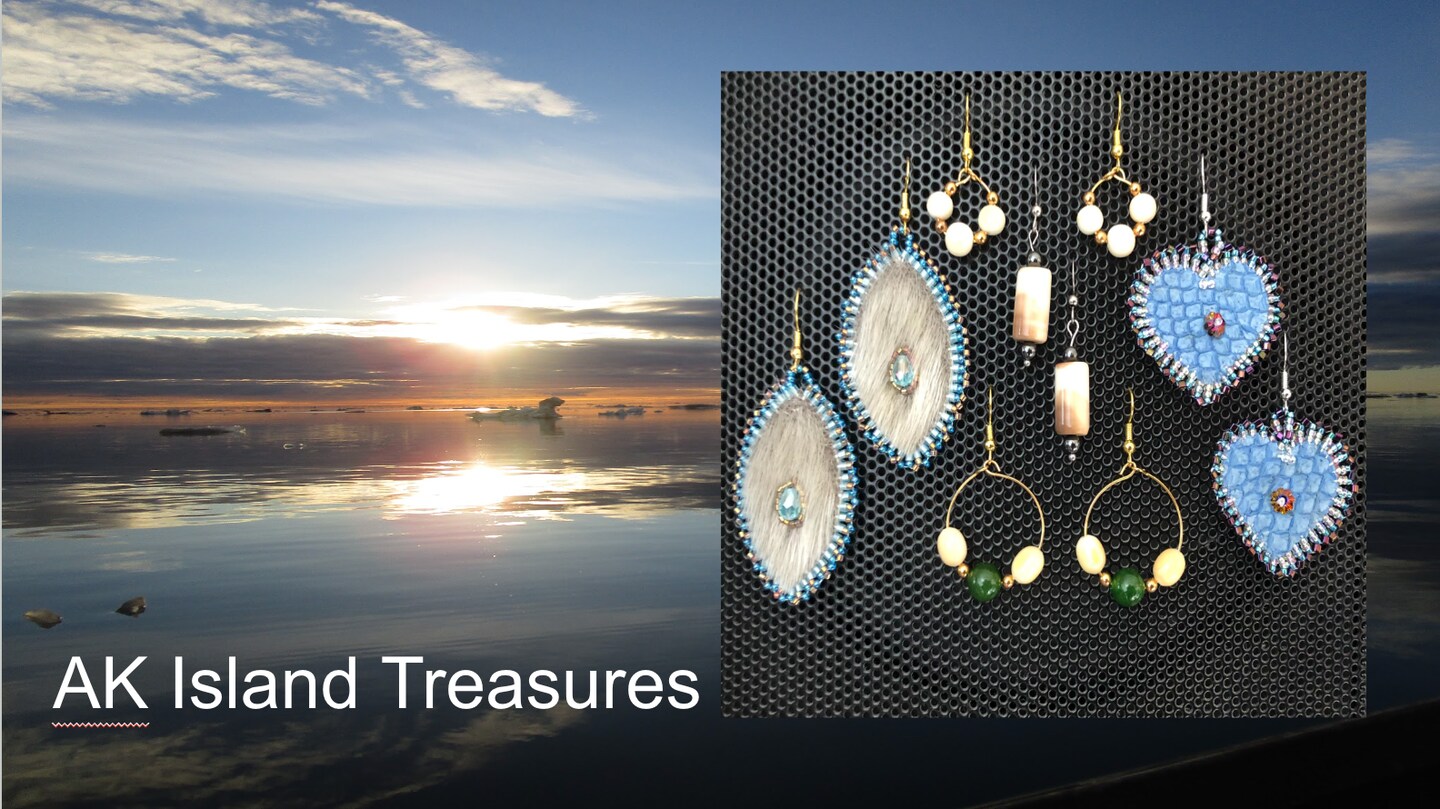 Wecome to AK Island Treasures Crafted and created Alaskan Native designed jewelry and decor. Handmade by an indigenous Inupiaq Eskimo creating designer of Shishmaref Alaska, utilizing legal altered MMPA sustainable harvested natural materials, seal, walrus, whale, polar bear and sea otter, embellished with salmon, mammoth, jade, leather, furs, and beads.