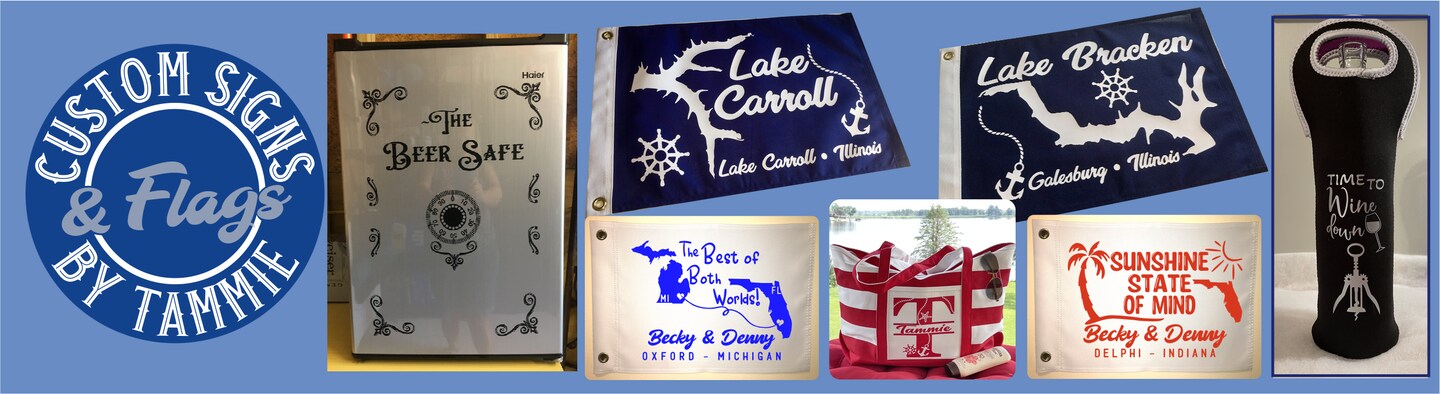 Welcome to Custom Signs & Flags by Tammie. My name is Tammie and I make Boat Flags, Golf Cart Flags and other fun things to spice up your fun adventures. For the Boat Flags, the most popular type has a silhouette of your lake, along with the lake name and town. The Golf Cart Flags are geared toward Snow Birds and Golfers. You may also request custom designs for either flag type.