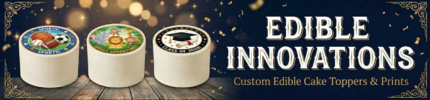 Custom Edible Cake Toppers & Cake Wrap Strips | Birthdays, Weddings, Baby Showers & More Shop premium custom edible cake toppers, edible cake wrap strips, and personalized photo cake decorations for every occasion. Perfect for birthday cakes, wedding cakes, baby shower cakes, graduation cakes, anniversary cakes, cupcakes, and cookies. Upload your photo, logo, or custom text and we'll print a vibrant full-color edible image on a premium frosting sheet using FDA-compliant edible ink. Available in full sheet, half sheet, quarter sheet, and cupcake topper rounds. Easy to apply on buttercream or fondant. Trusted by home bakers and professional bakeries nationwide. Gluten-free and allergen-free. Stores up to 12 months at room temperature. Free shipping available with Priority and Express upgrades.