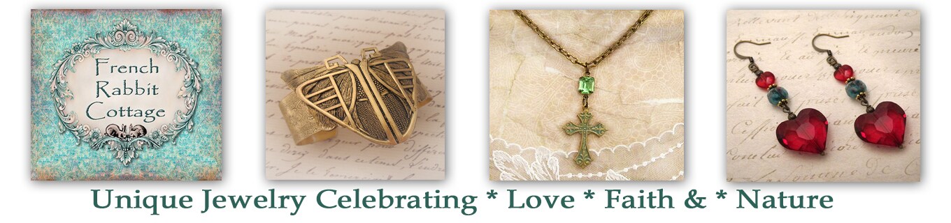 Welcome to French Rabbit Cottage! Unique handcrafted jewelry celebrating Love, Faith and Nature! You'll find eye catching * Earrings, * Cuff Bracelets, * Lockets, * Necklaces, * Brooch Pins and more! With styles ranging from Art Nouveau, to Art Deco, Victorian, Boho and Trendy too! Many with a French theme. Yes, there is a French Rabbit for which this shop is named. Thanks for stopping by! Enjoy!