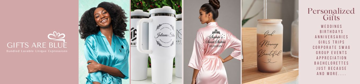 Welcome to Gifts Are Blue. The Blue in our name stands for Bundled Luvable Unique Expressions. We love helping our customers build memories, while putting a smile on someone's face. We are a family business that reside in Frisco, Texas. Our gift store started in 2015, but in 2021 we transitioned into personalized gifting. All items are customized and personalized in our store to create that one of a kind gift. We believe in taking care of our customers and getting your gift into your hands as soon as possible. We focus on quality and details. Please know that we are only an email or phone call away in case you ever have a question or concern. Whether you are shopping for gifts for the bride to be, bridesmaid proposal gifts, groomsmen gifts, anniversary gifts, new home gifts, birthday gifts, Christmas gifts or more, we have you covered. We personalize a wide array of items including robes, slippers, t-shirts, tumblers, glasses, cutting boards, totes, photo frames, jewelry and so much more. We will be adding to our store regularly, so check back often. New to our collection this year is our Corporate Swag gifts. Thanks for checking us out!