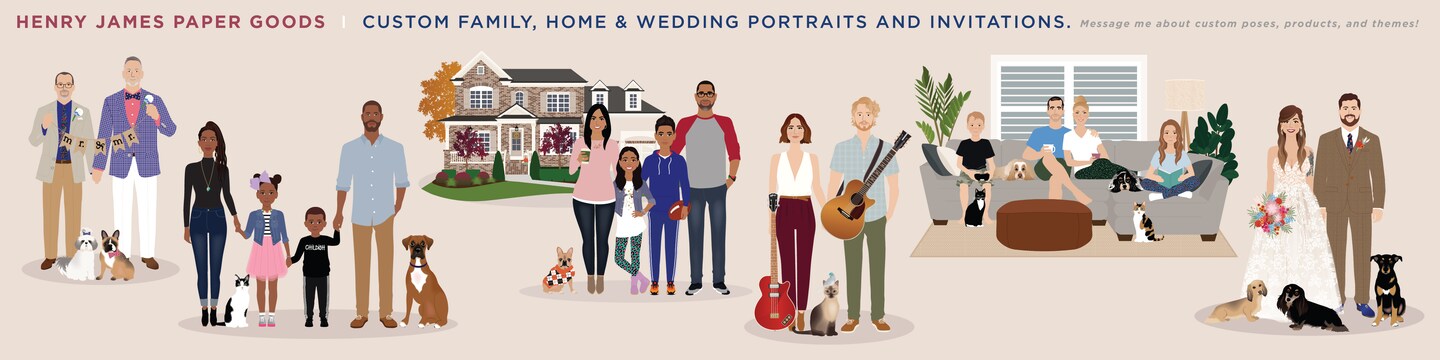 Hello! I am kadie, sole owner and creator of custom hand drawn family, home, pet and wedding portraits and invitations for Henry James Paper Goods located in Webster Groves, Missouri. I am in my 12th year of drawing portraits - and I still deeply enjoy the process every day. My portraits are 100% drawn and personalized by me for each unique family. Each portrait comes with a museum quality fine art print on heavyweight and archival fine art paper and printed with Ultrachrome inks to last a lifetime. Portraits can be created to represent your family in any way possible…colors, apparel, accessories, props, pets, themes, custom poses, costumes, characters, and more. Message me with your ideas for your own one of a kind family or wedding portrait - I relish in the special details that make your family uniquely 'us'. I am proud to say that I don't outsource my creative work to third party services, nor do I purchase stock portrait templates from outside sources, unlike many of the portraits seen today. My portraits are a one-of-a-kind labor of love. :) All artwork used on this website is copyrighted and may not be downloaded or used without permission from kadie foppiano.