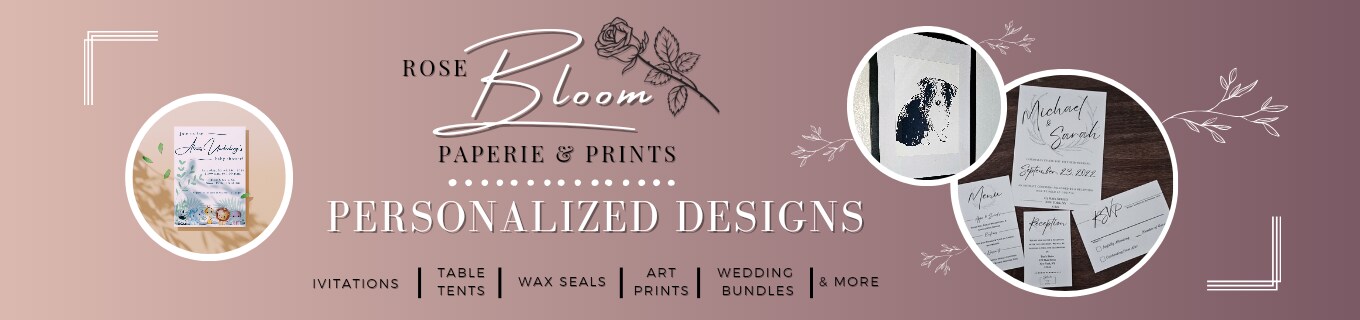 Welcome to Rose Bloom Paperie! I started this business after completely DIYing my own wedding. It was a huge task! Now I help others prepare for their events by designing, printing, and cutting personalized & unique stationary ranging from invitations, RSVPs, table tents, and more. I also offer custom art prints for meaningful home decor. Check out my store for more info.