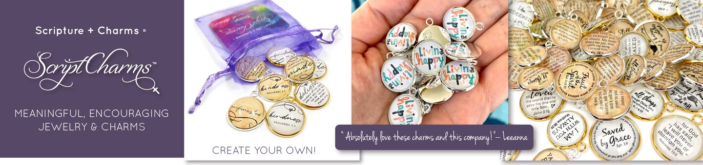 Scripture + Charms = ScriptCharms! Greta and Addie – a mother/daughter team from Wisconsin – have been designing and handcrafting ScriptCharms meaningful and encouraging Scripture jewelry and charms since 2013. Create your own jewelry and craft projects with our glass jewelry making charms – add to bracelets, purses, zippers, necklaces, backpacks, bookmarks… the possibilities are endless!