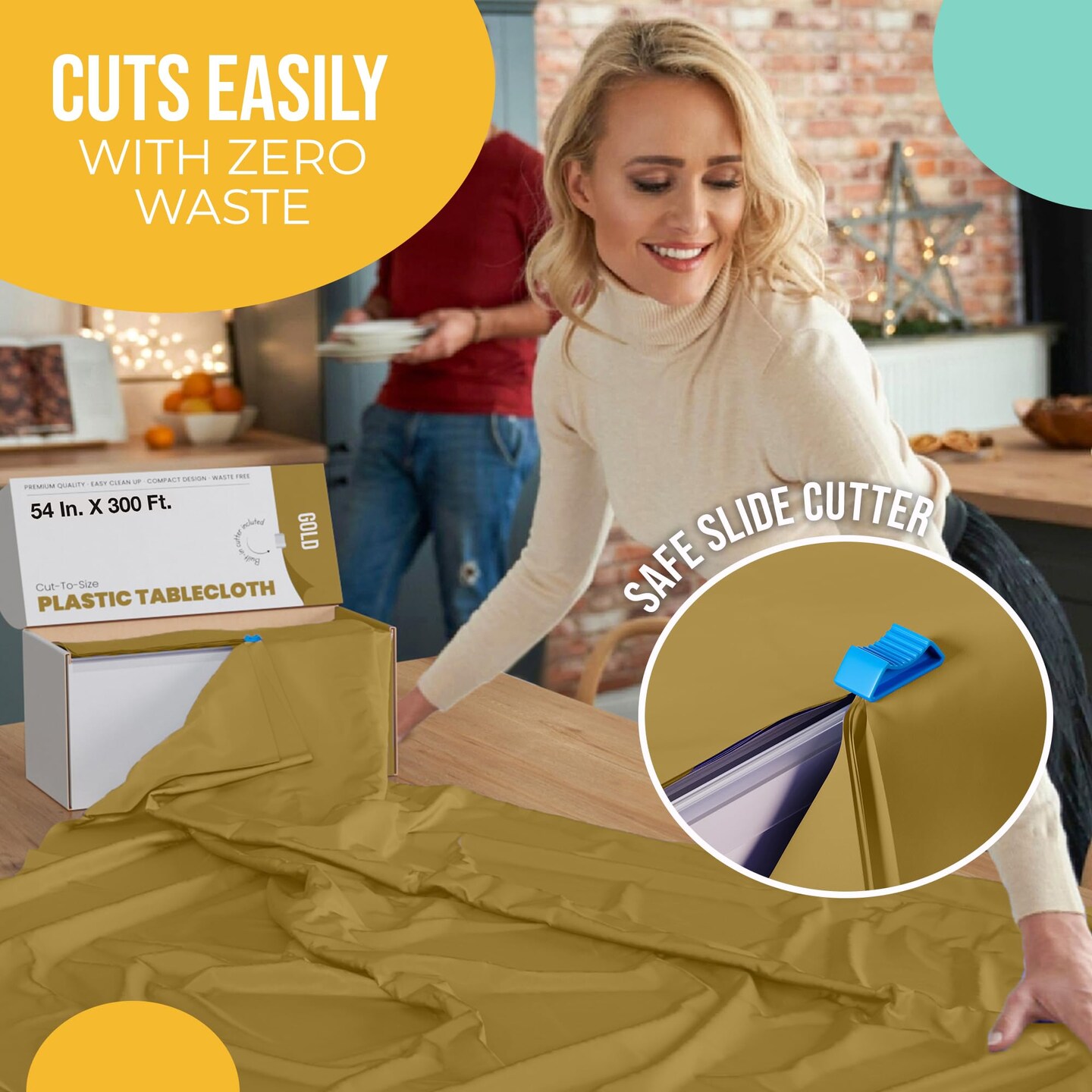 Party Solids 54" x 300' Plastic Table Cover Roll with Slide Cutter – Cut-to-Size Dispenser Box – Makes Up to 36 Disposable 8' Rectangle Tablecloths by Exquisite