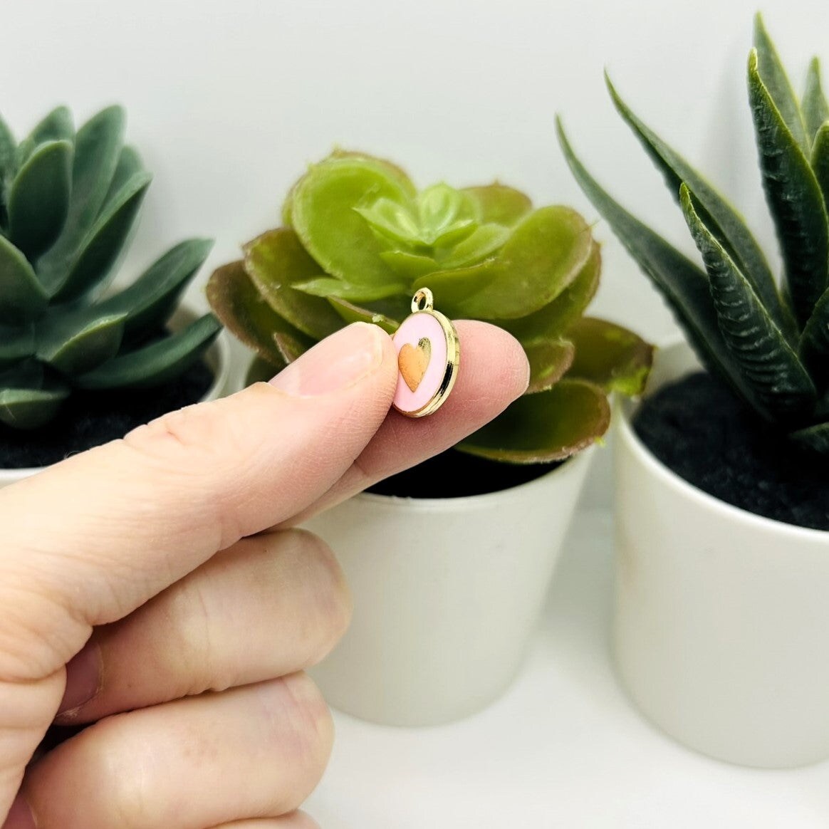 1, 4, 20 or 50 Pieces: Pink and Gold Round Heart Charms - Double Sided