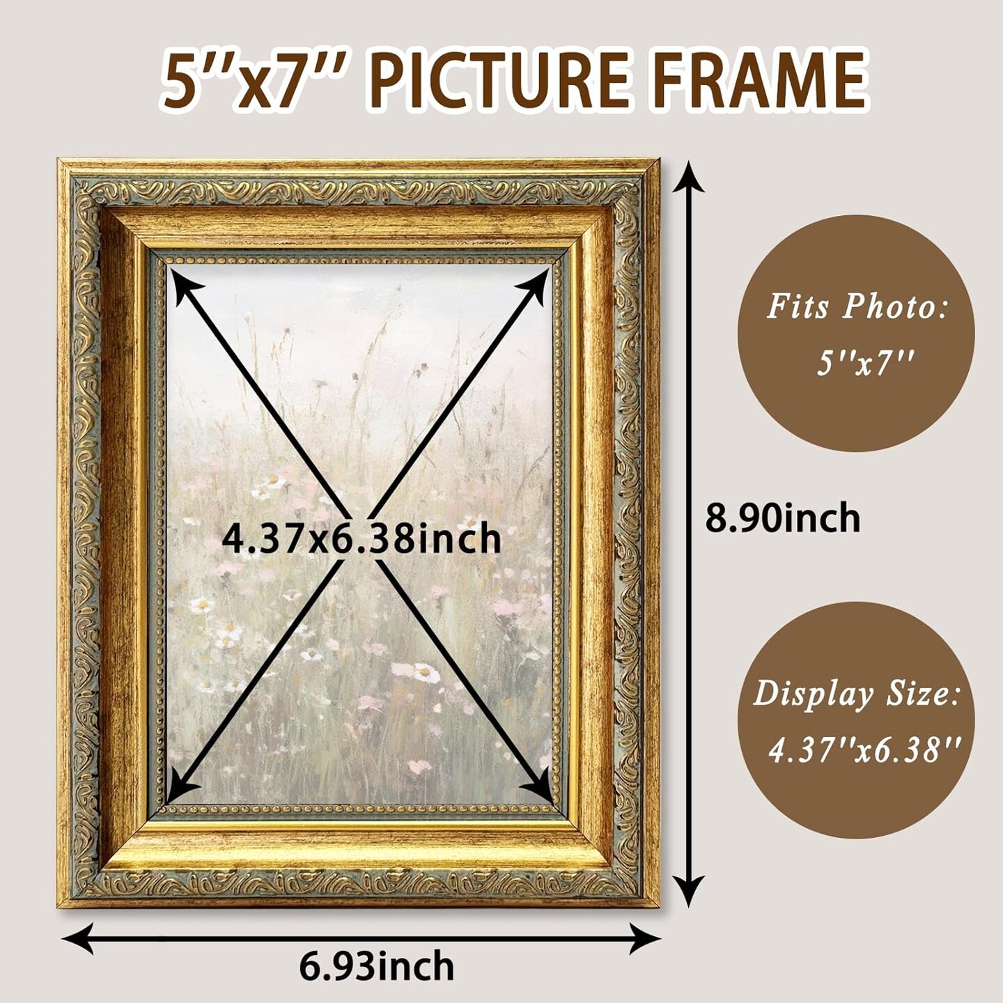 1 Pack 5x7 Picture Frame - Ornate Vintage Gold Frame with HD Glass