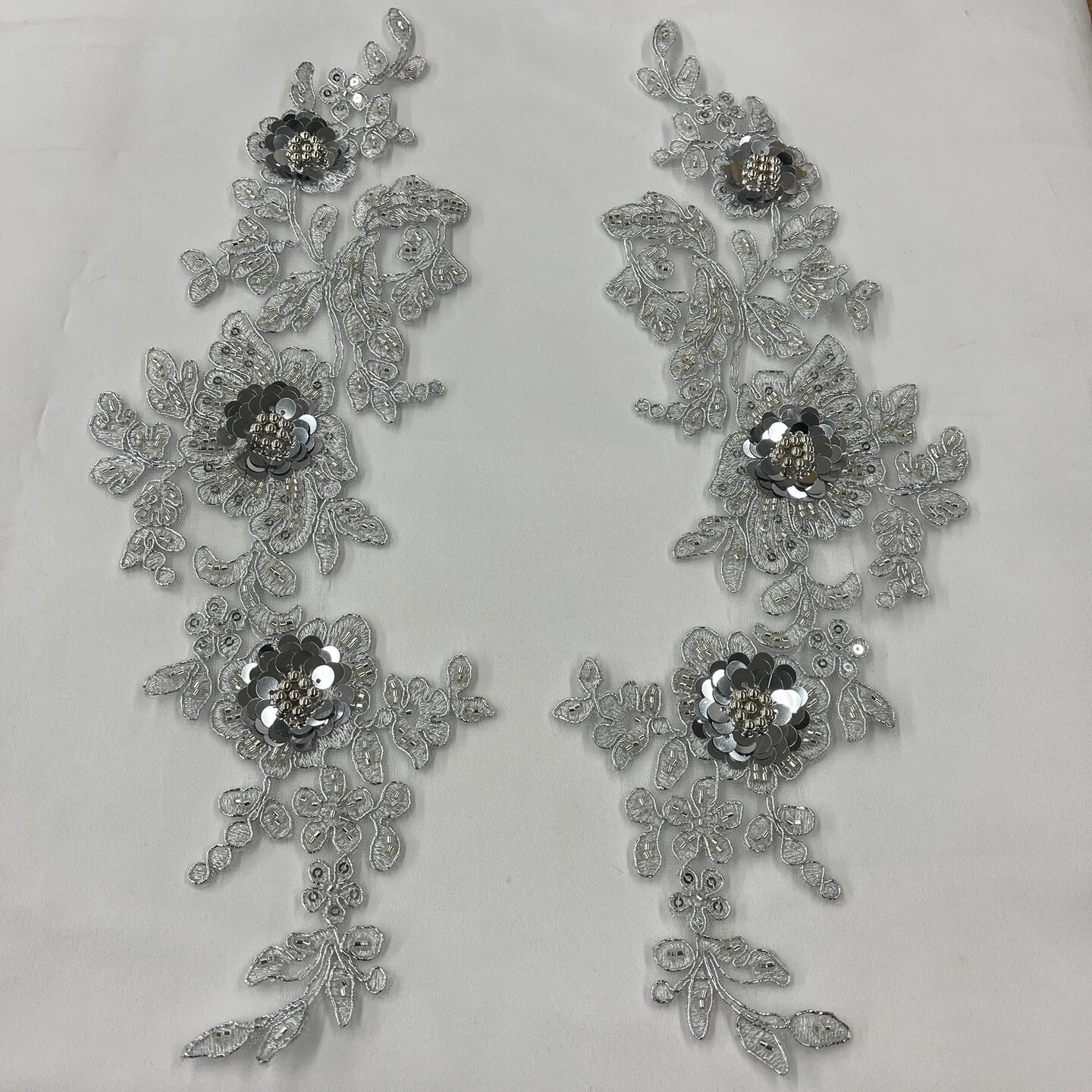 1 Pair Beaded & Corded Floral 3D Lace Applique Embroidered on 100% Polyester Net Mesh, 14" X 3 " Wide Each Side