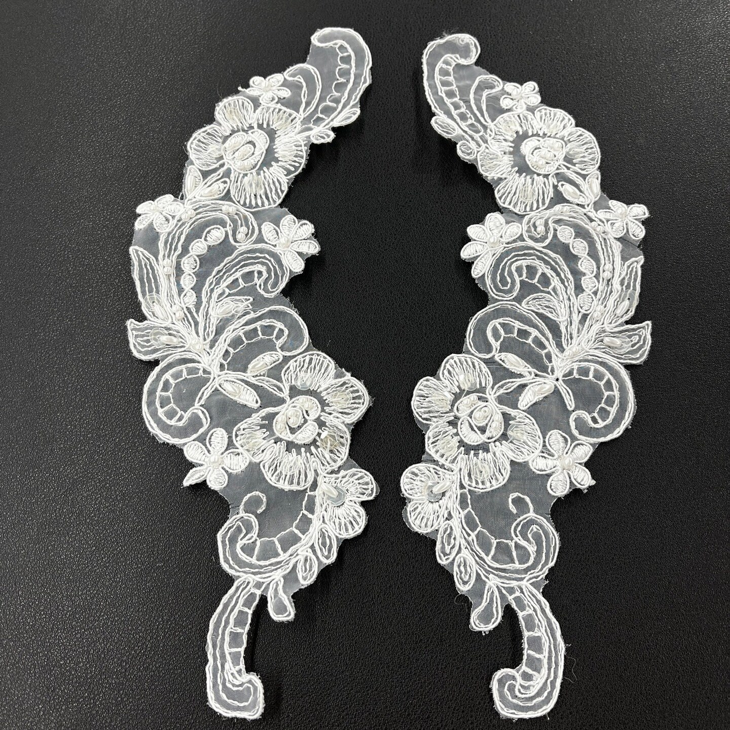 1 Pair Beaded & Corded Floral Lace Applique 10" x 3" Each Side