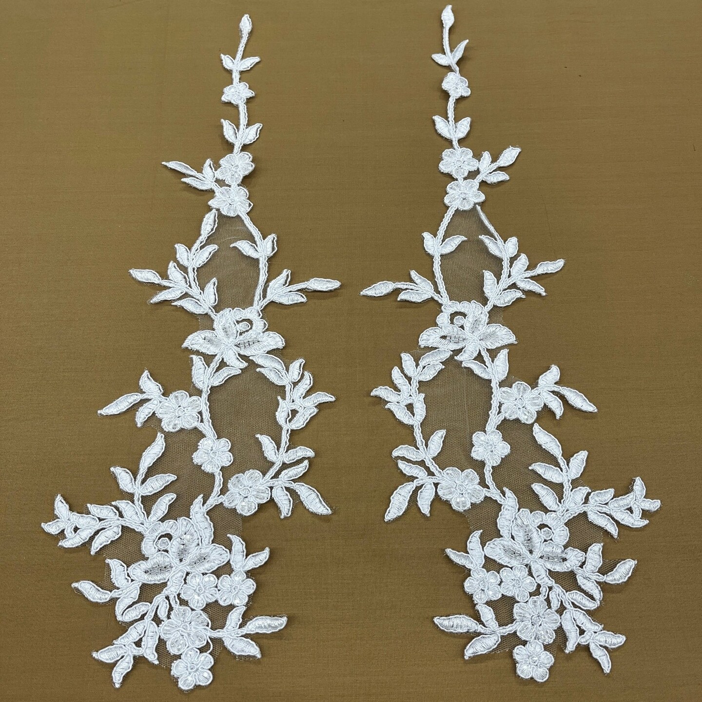 1 Pair Beaded & Corded Floral Lace Applique 17" X 4.5" Each Side, 100% Polyester Net Mesh