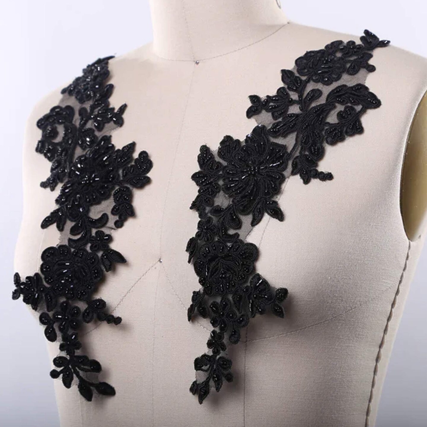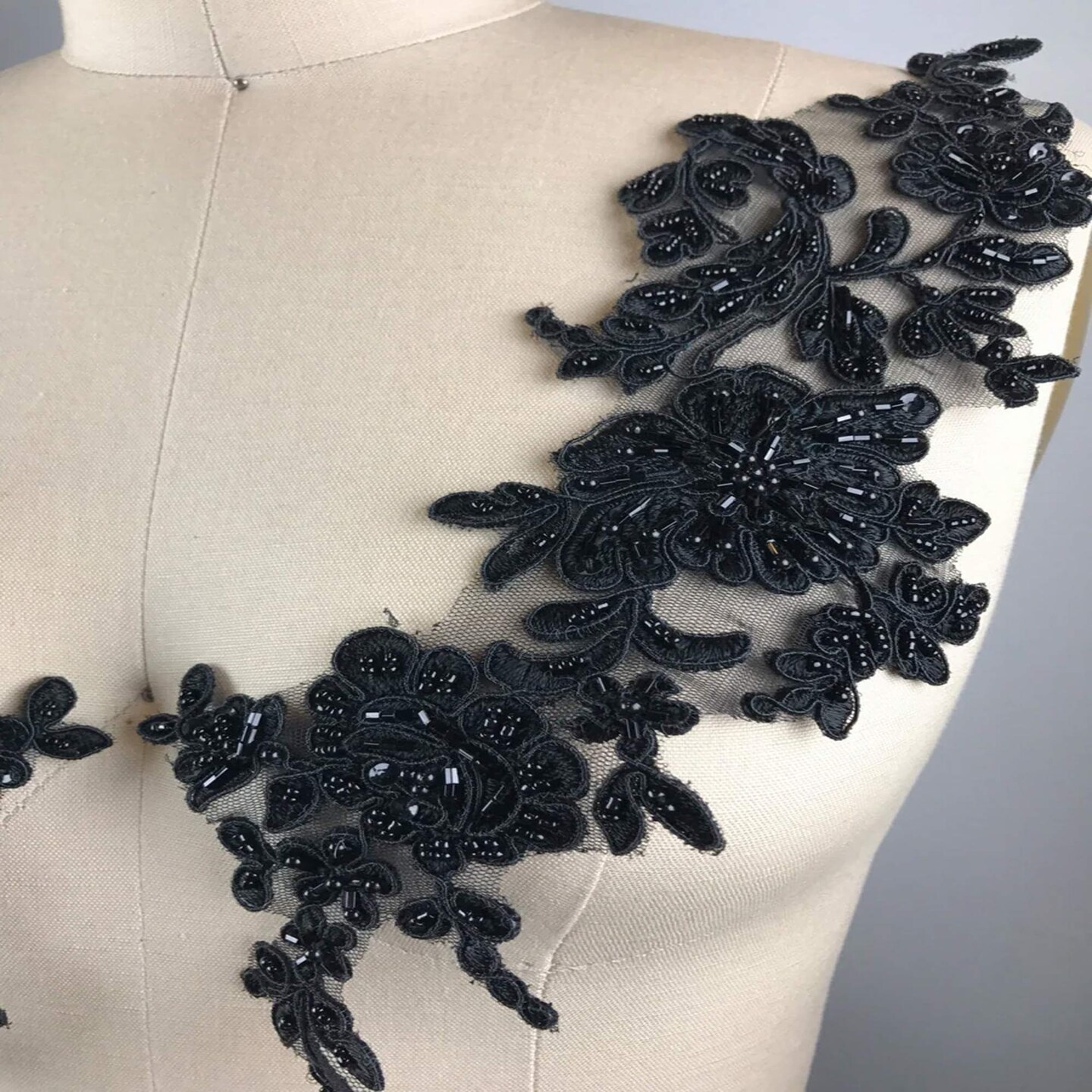 1 Pair Black Lace Applique Mirrored with Delicate Beads and Fine Netting