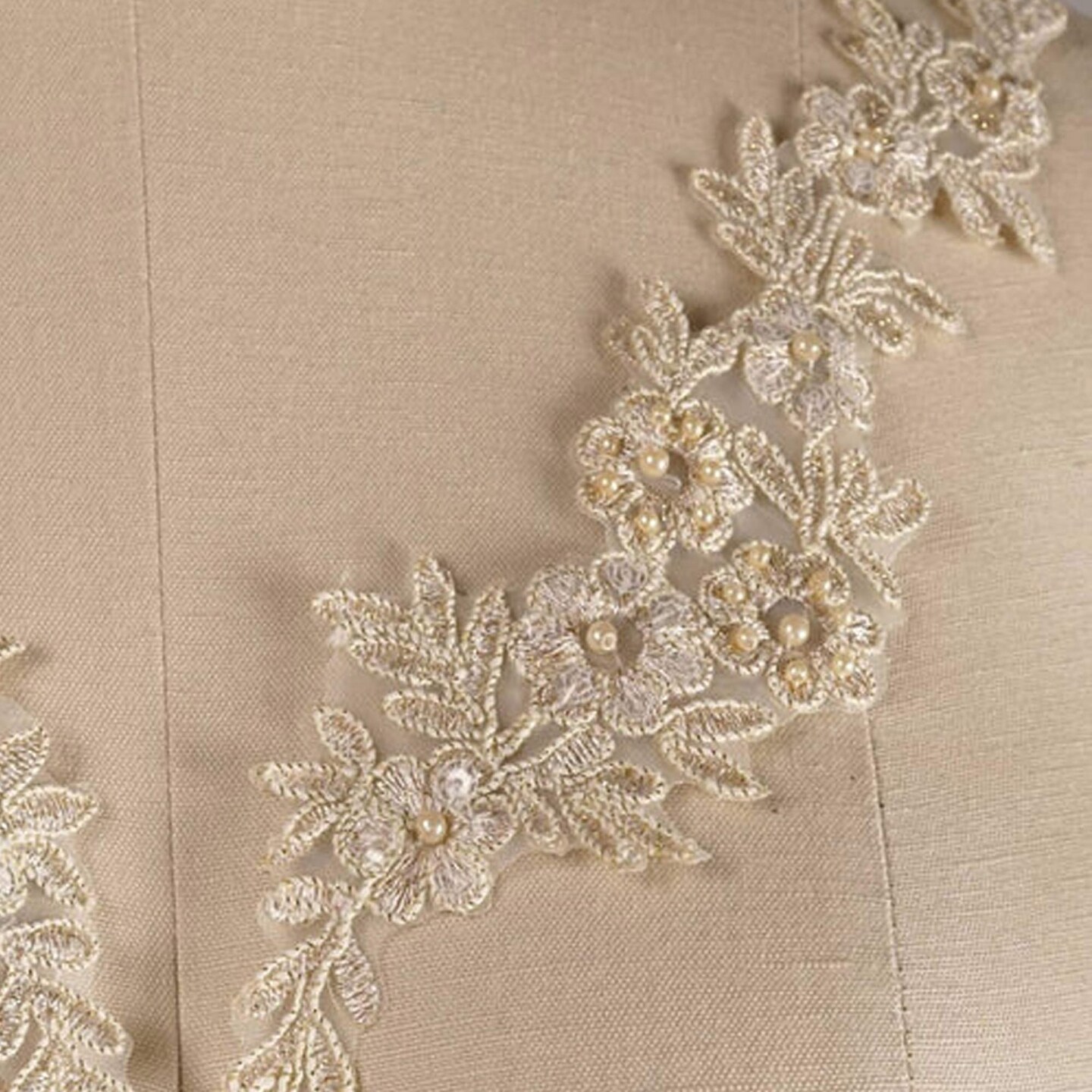 1 Pair Champagne Gold Alencon Lace Applique Metallic Beige with Pearls Symmetrical Design
