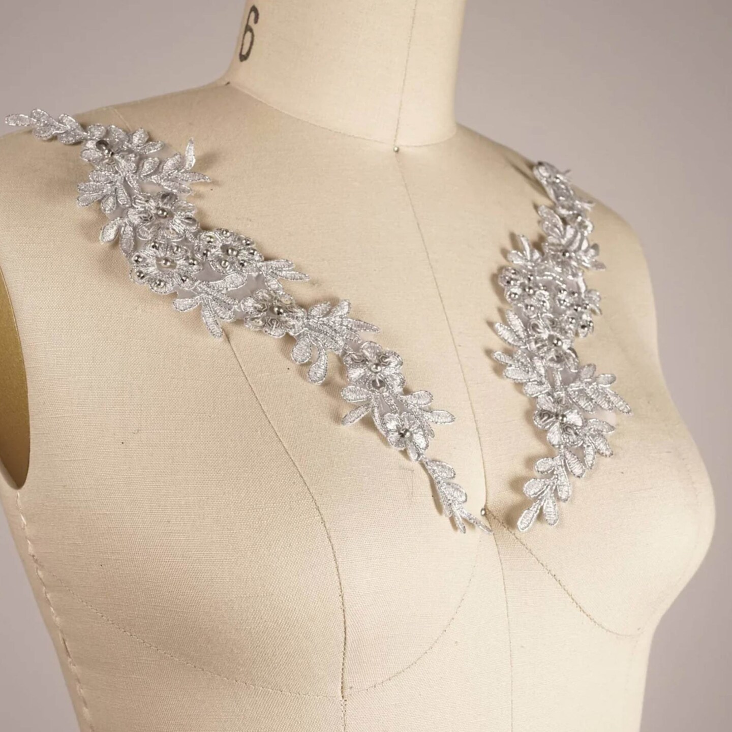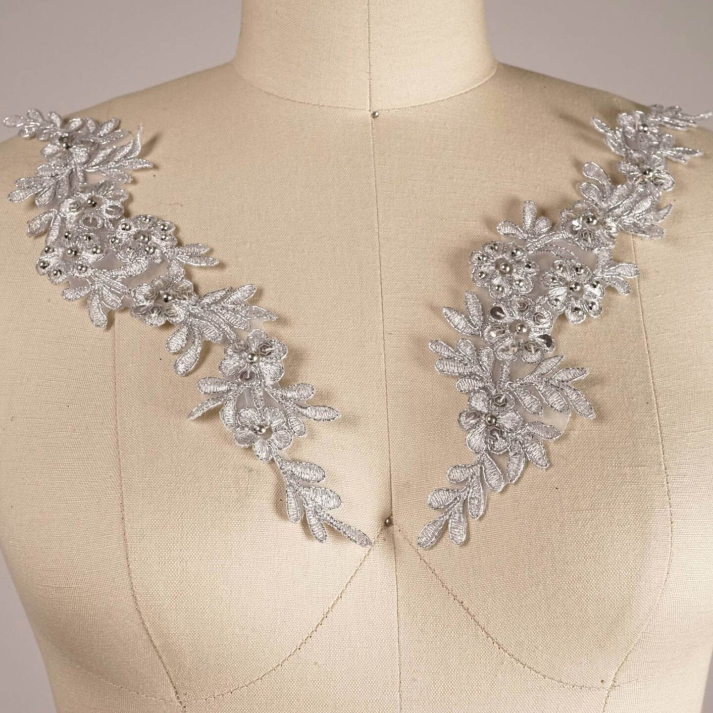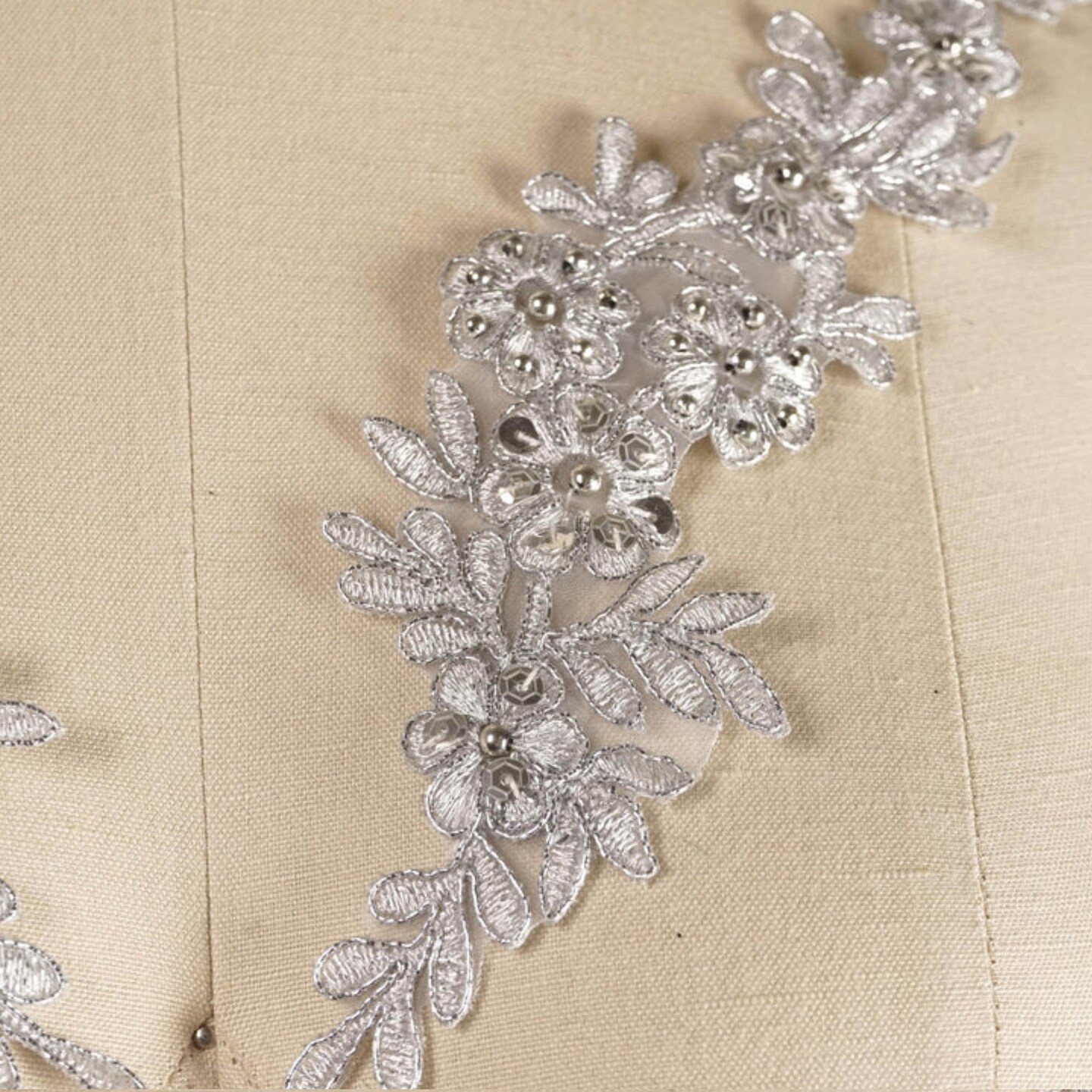 1 Pair Metallic Silver Alencon Lace Appliques with Sequins and Pearls for Gowns and Costumes