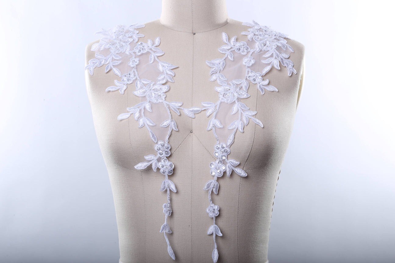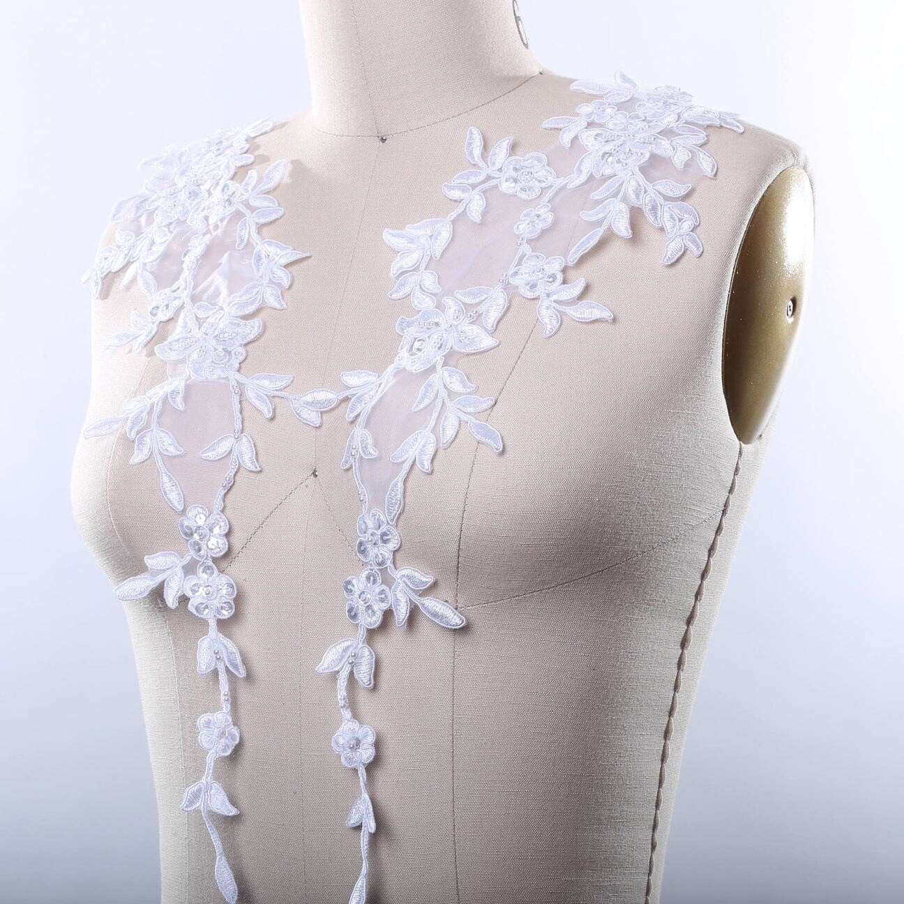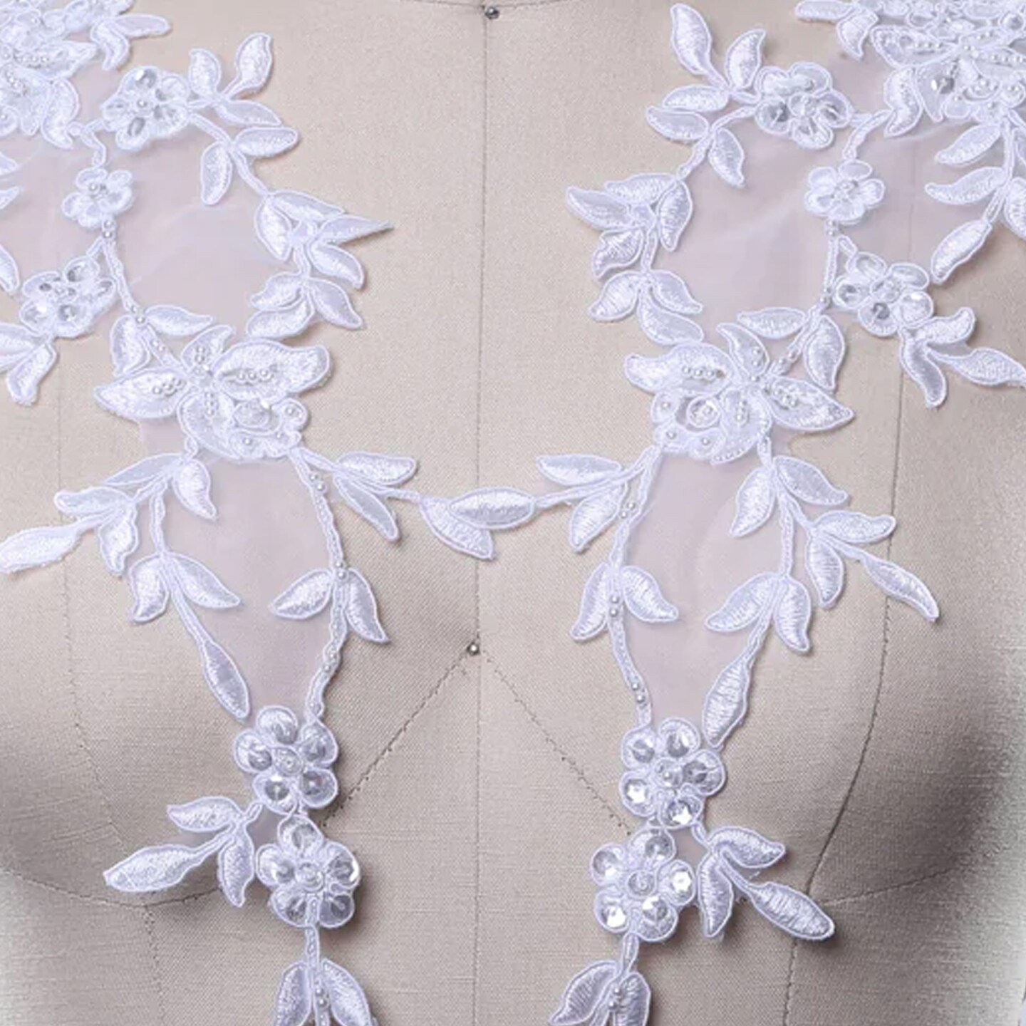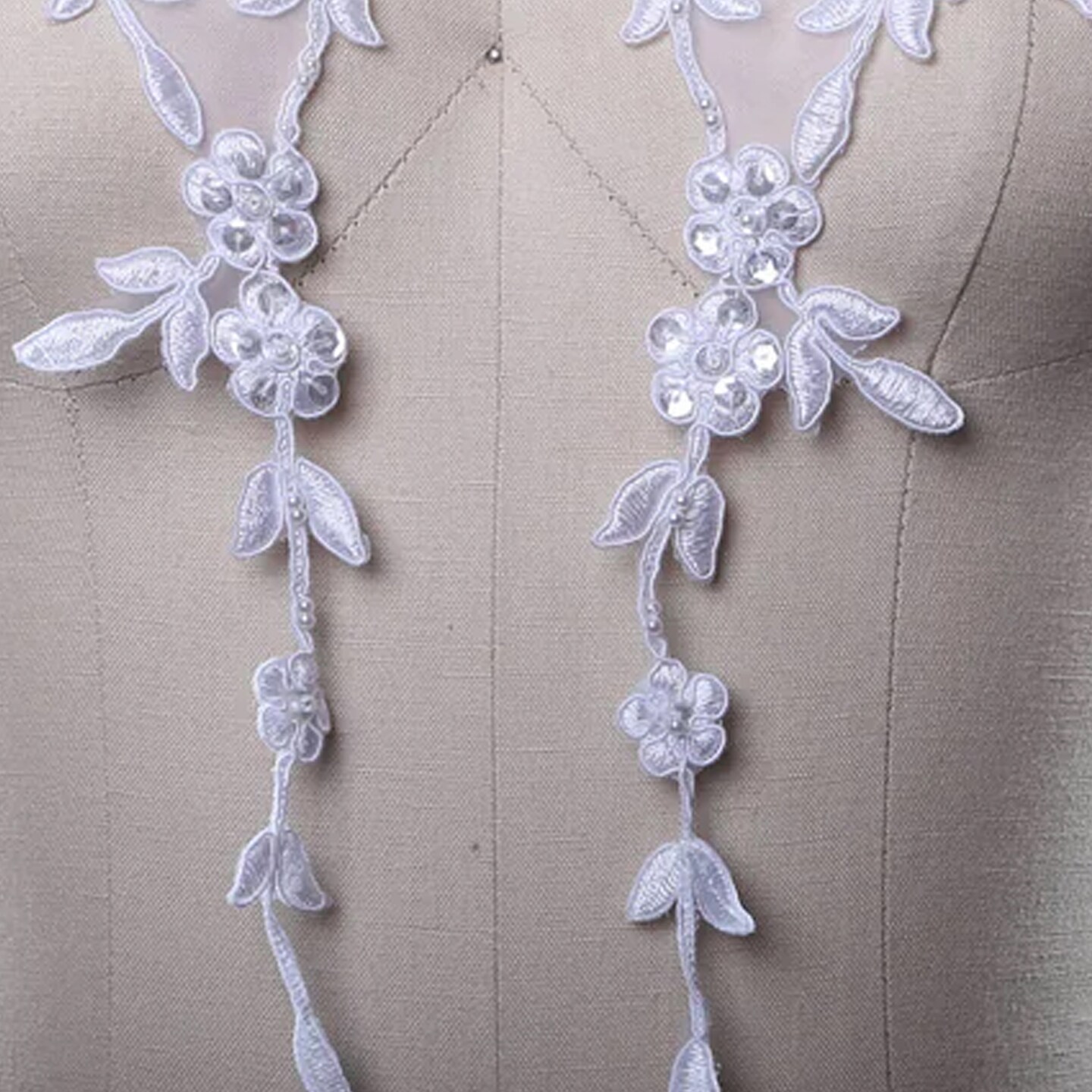 1 Pair White Beaded Floral Lace Applique 16" Elegant Bridal Gown Or Veil Embellishment