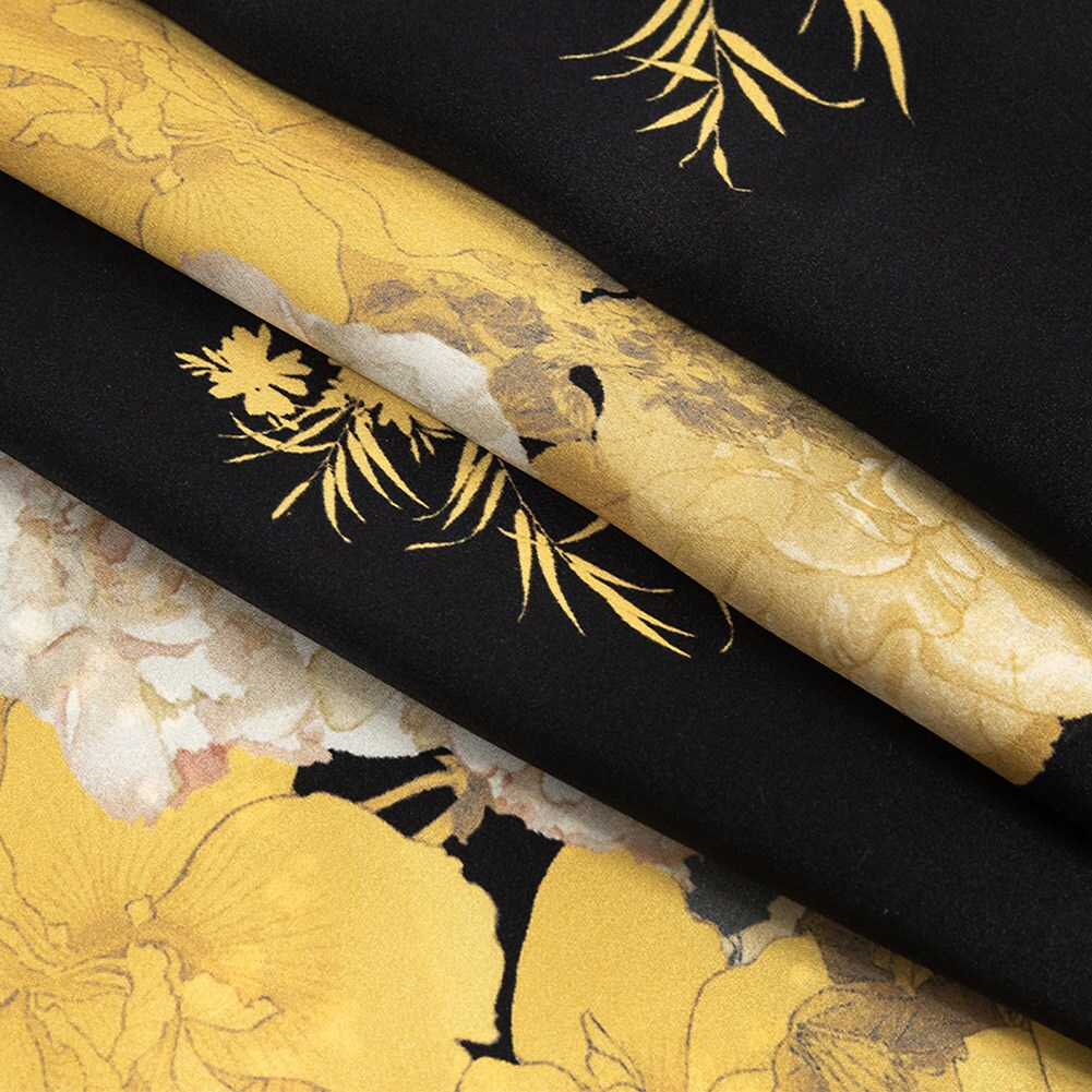 1 Panel Exclusive Gold and Black Silk Charmeuse 53" Wide Floral Border Print for Dresses & Blouses