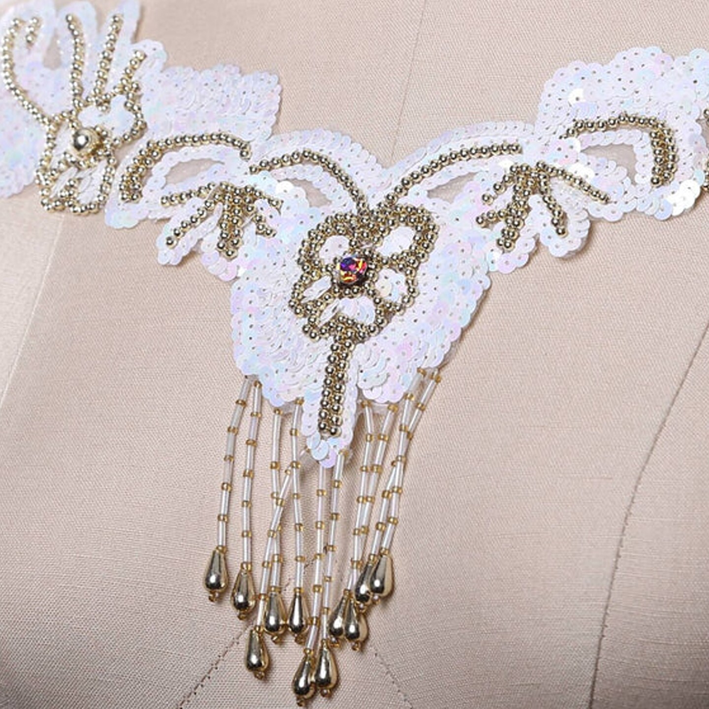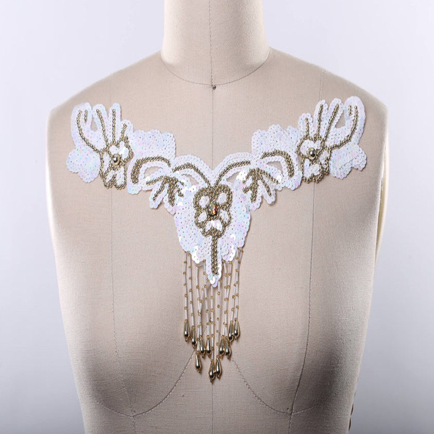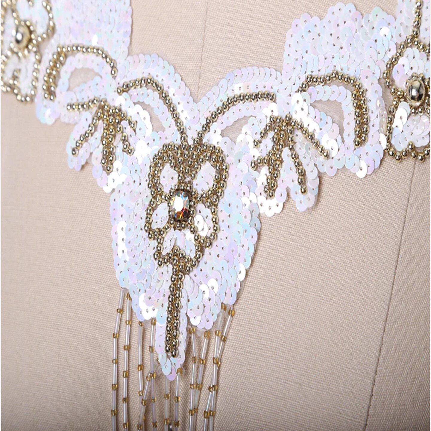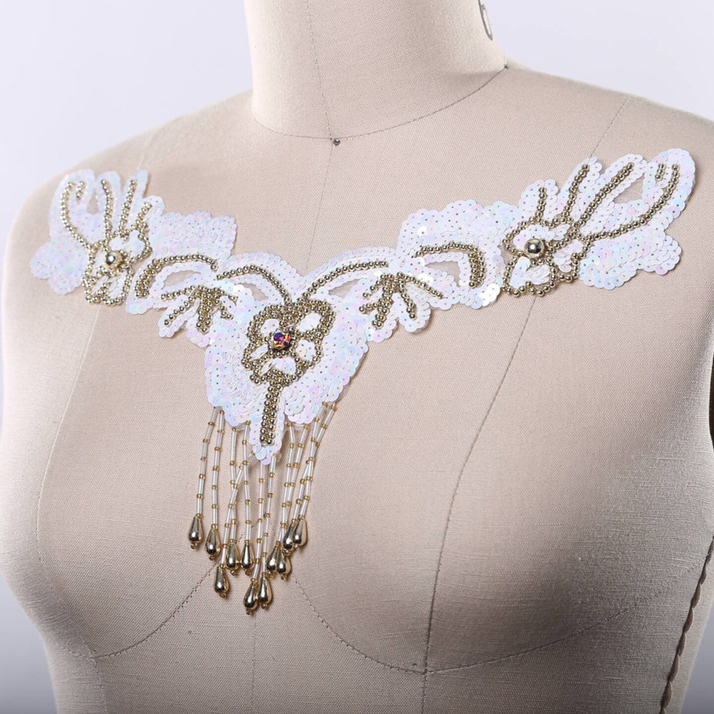 1 Piece Gold Sequin V Shaped Applique with Beaded Fringe and Rhinestone Embellishment