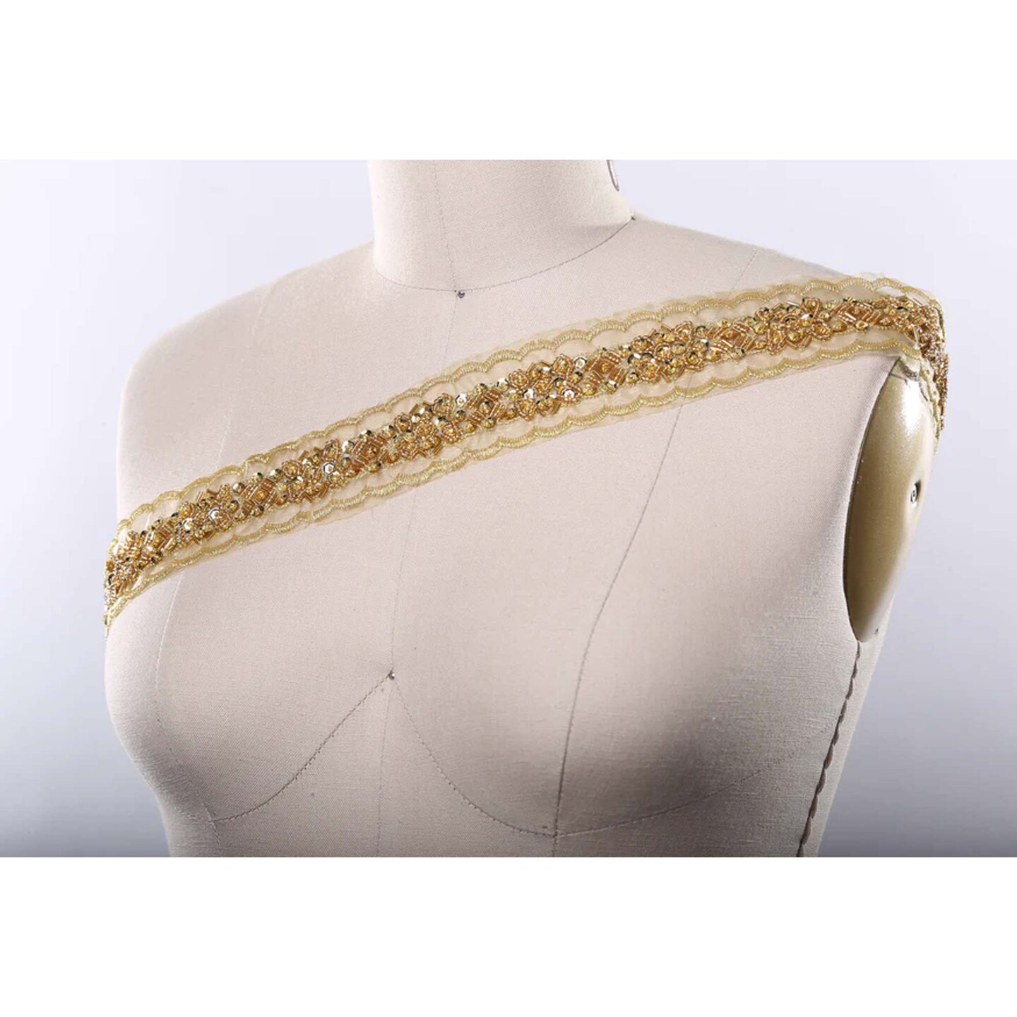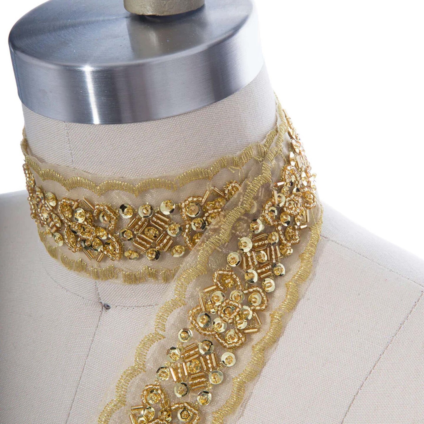 1 Yard 1.75" Wide Gold Beaded & Sequin Ribbon Trim with Embroidered Edging Organza Lace Accent