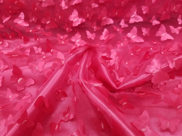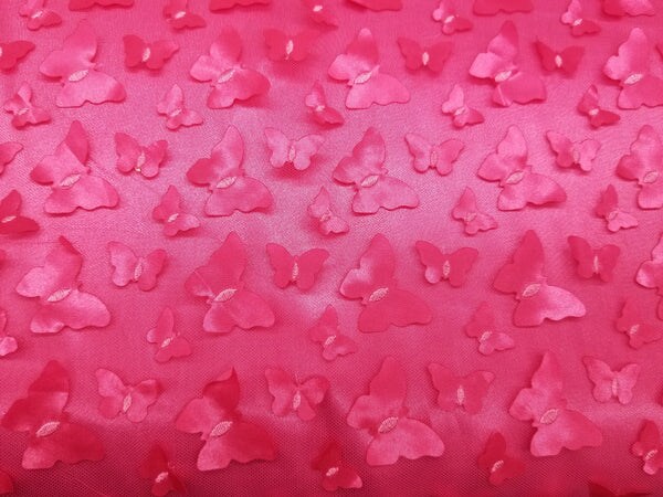 1 Yard 3D Butterfly Embroidered Fuschia Mesh Lace Fabric for Dresses and Crafts.