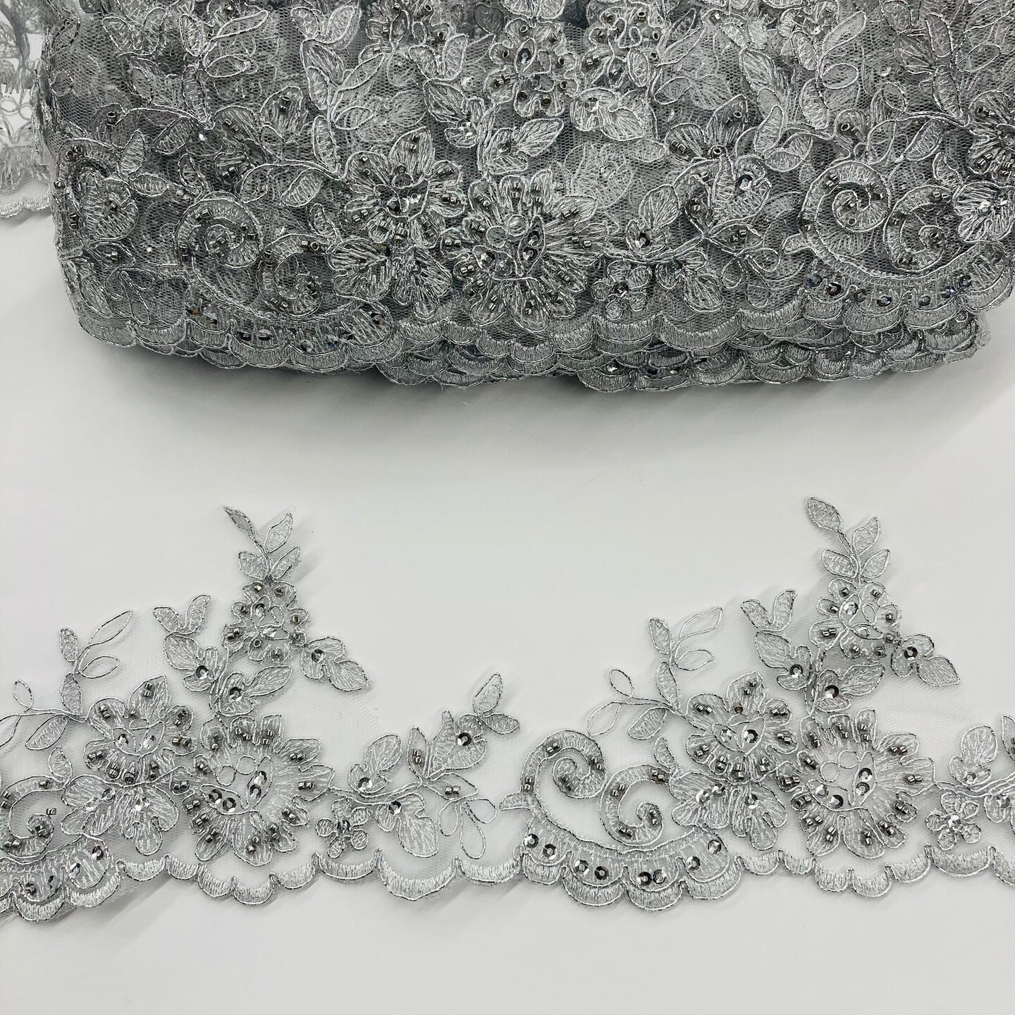 1 Yard 4″ Wide Beaded & Corded Lace Trimming Embroidered on 100% Polyester Net Mesh