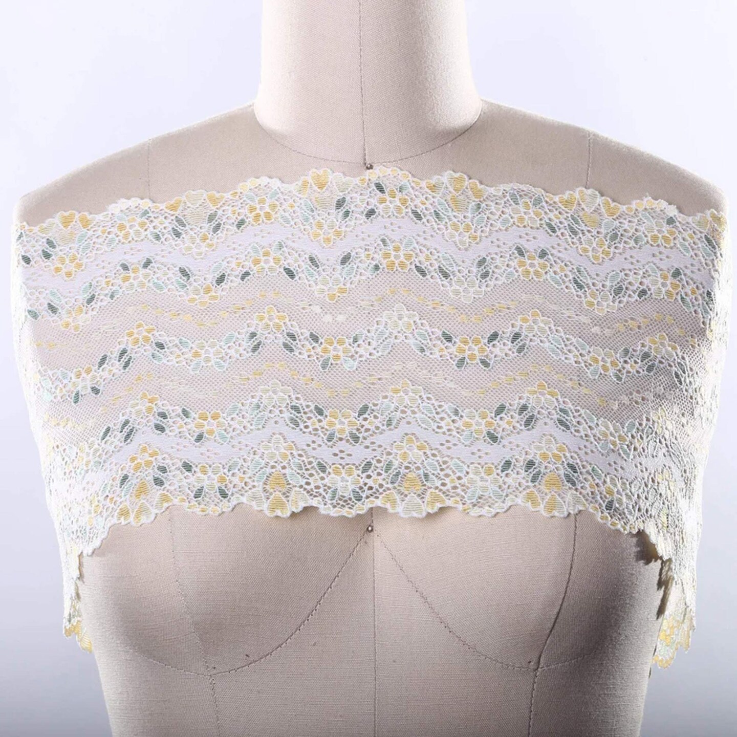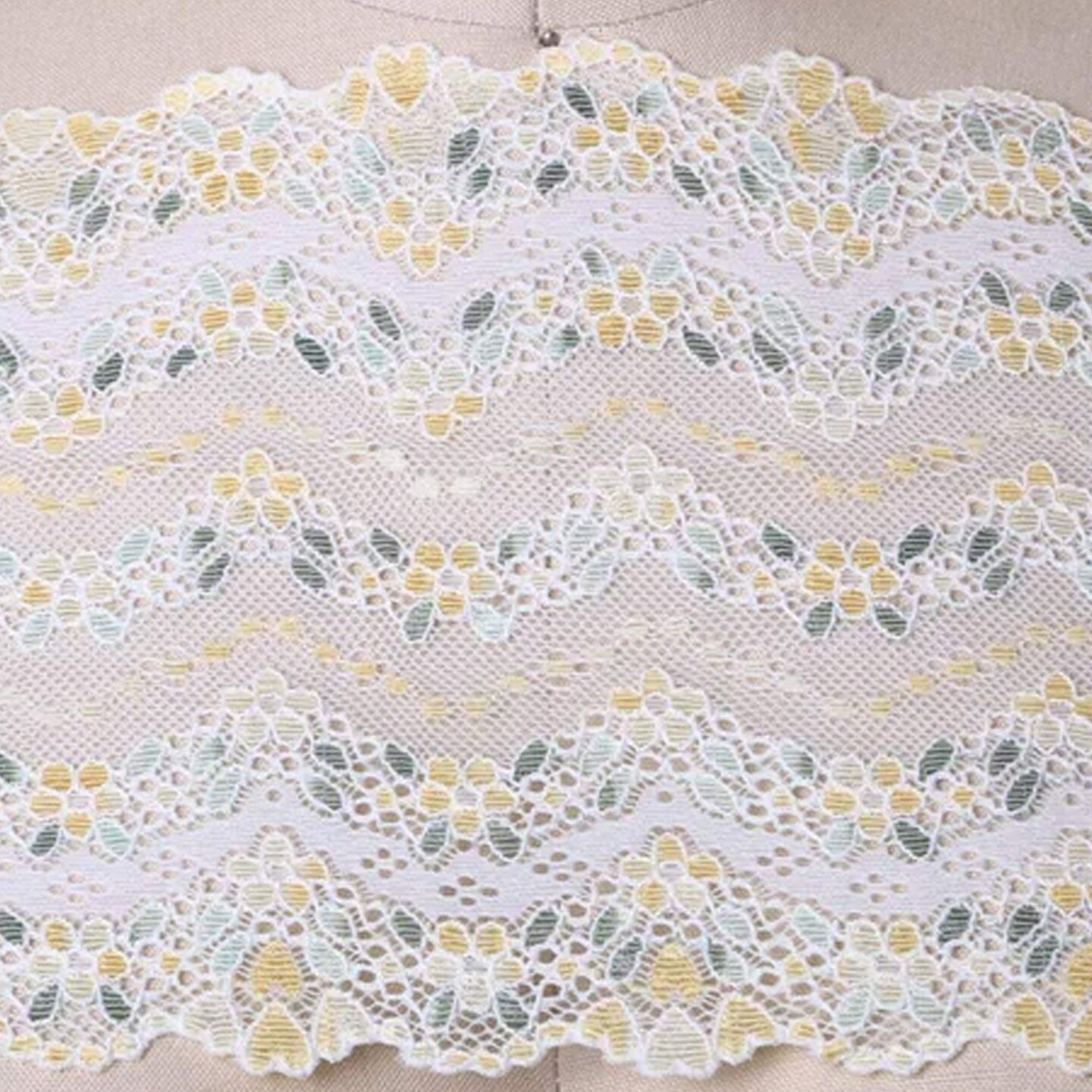 1 Yard 7" Wide Yellow Floral Stretch Lace Trim Lemony Flowers & Green Leaves on White