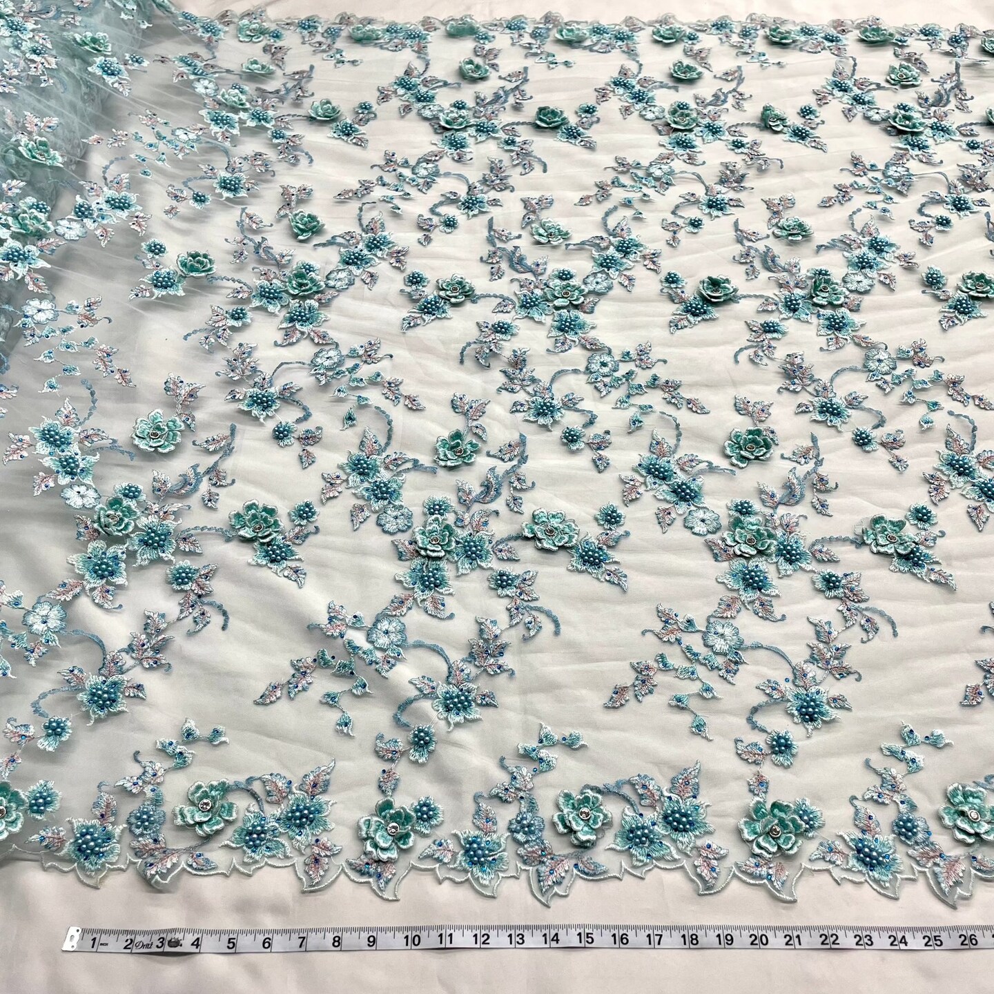 1 Yard Aqua Beaded 3D Floral Lace Fabric Embroidered on Polyester Net Mesh 54 inch Width