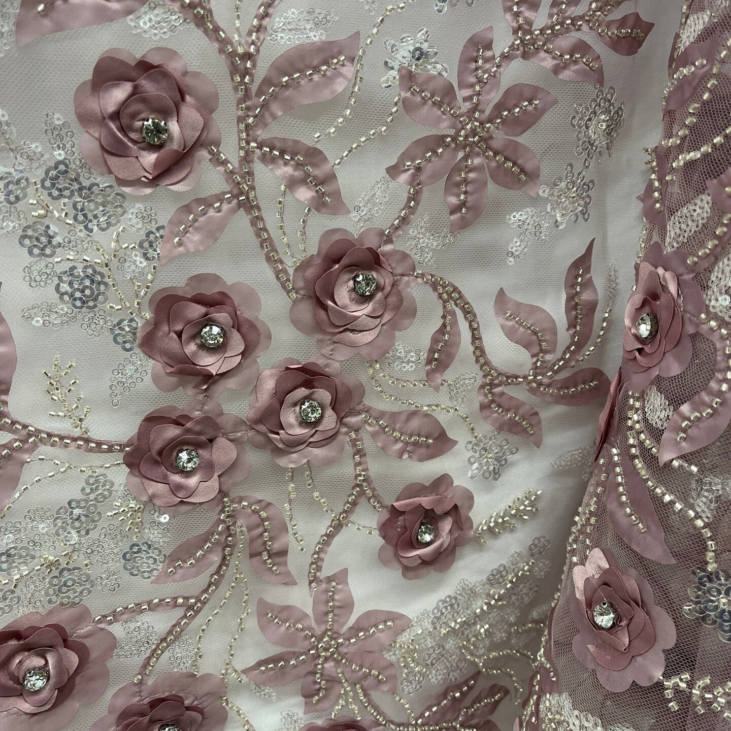 1 Yard Beaded 3D Floral Lace Fabric Embroidered 100 Percent Polyester Net Mesh 52 inch Width