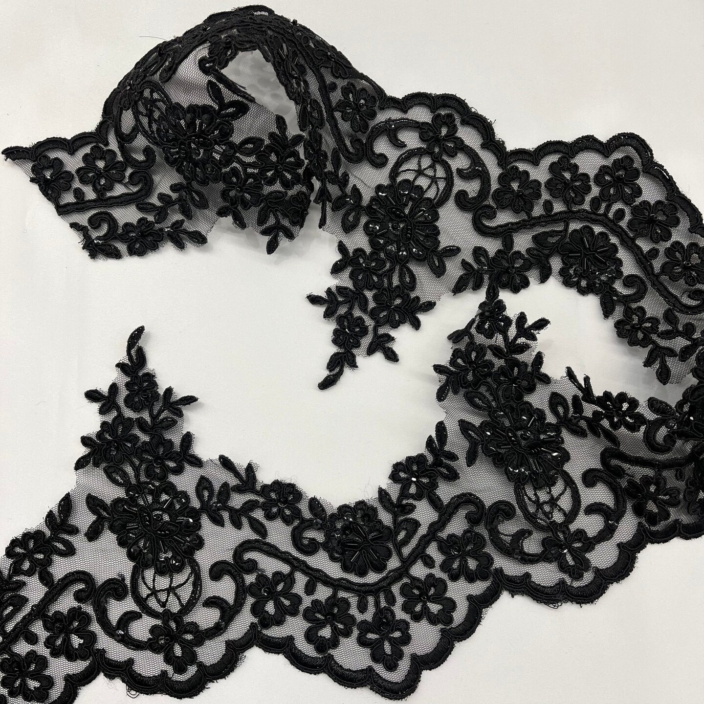 1 Yard Beaded & Corded Floral Lace Trimming Embroidered on 100% Polyester Net Mesh 6" Wide