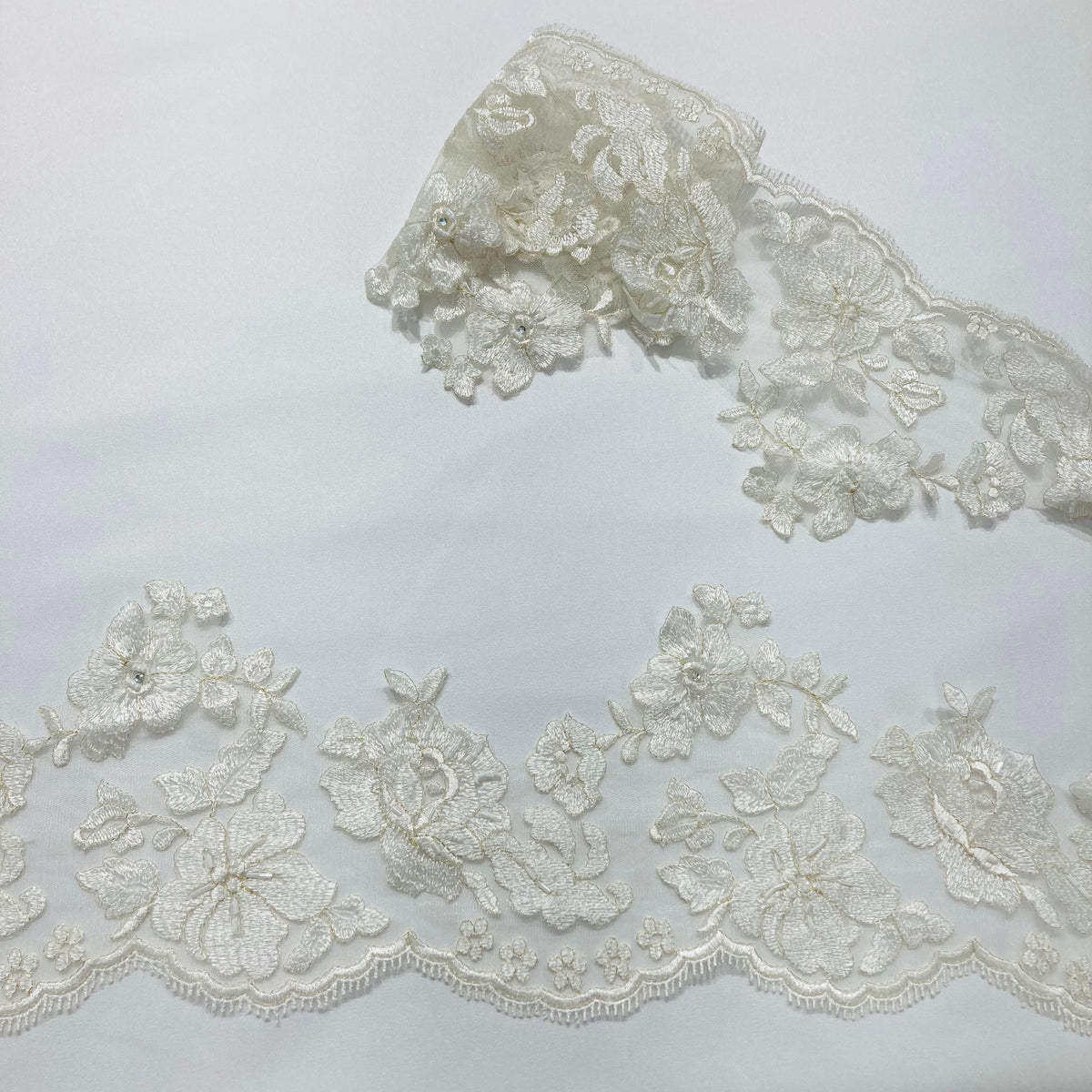1 Yard Beaded Floral Lace Trimming on 100% Polyester Mesh, Embroidered Lace for Dresses & Decor