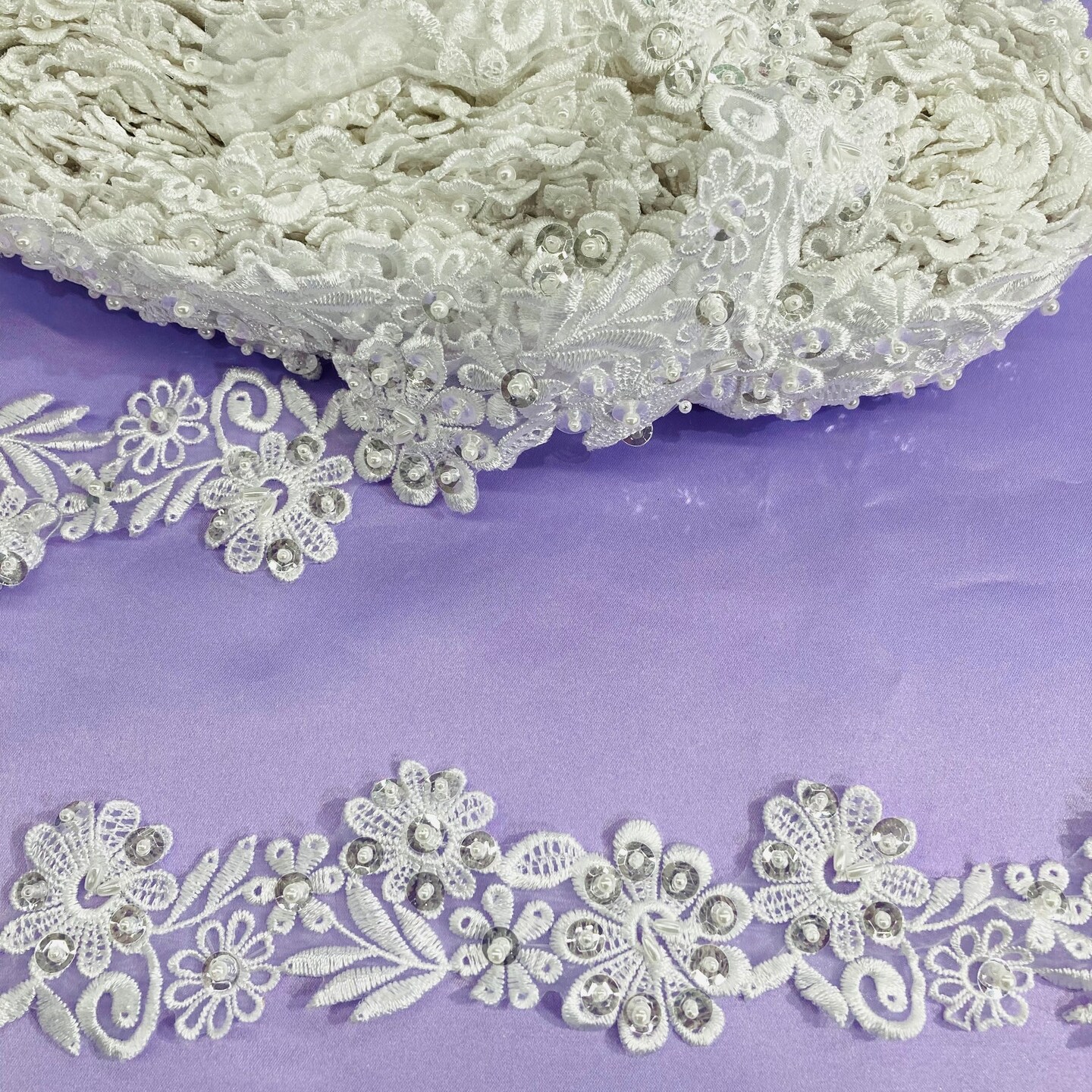 1 Yard Beaded Lace Trimming on Organza | 2" Wide | Elegant Embroidered Trim for Bridal, Formalwear & Costumes