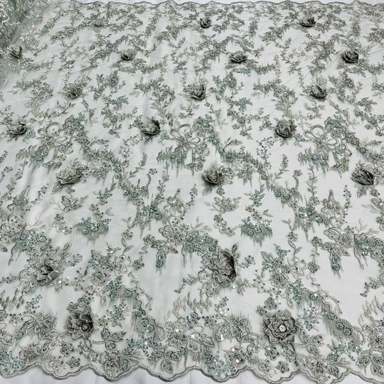1 Yard Beaded Rhinestone 3D Floral Lace Fabric Embroidered 100 Percent Polyester Net Mesh 50 inch Width
