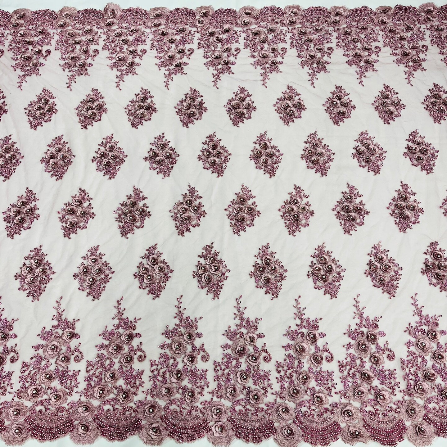 1 Yard Beaded Rhinestone 3D Floral Lace Fabric Embroidered on Polyester Mesh 54