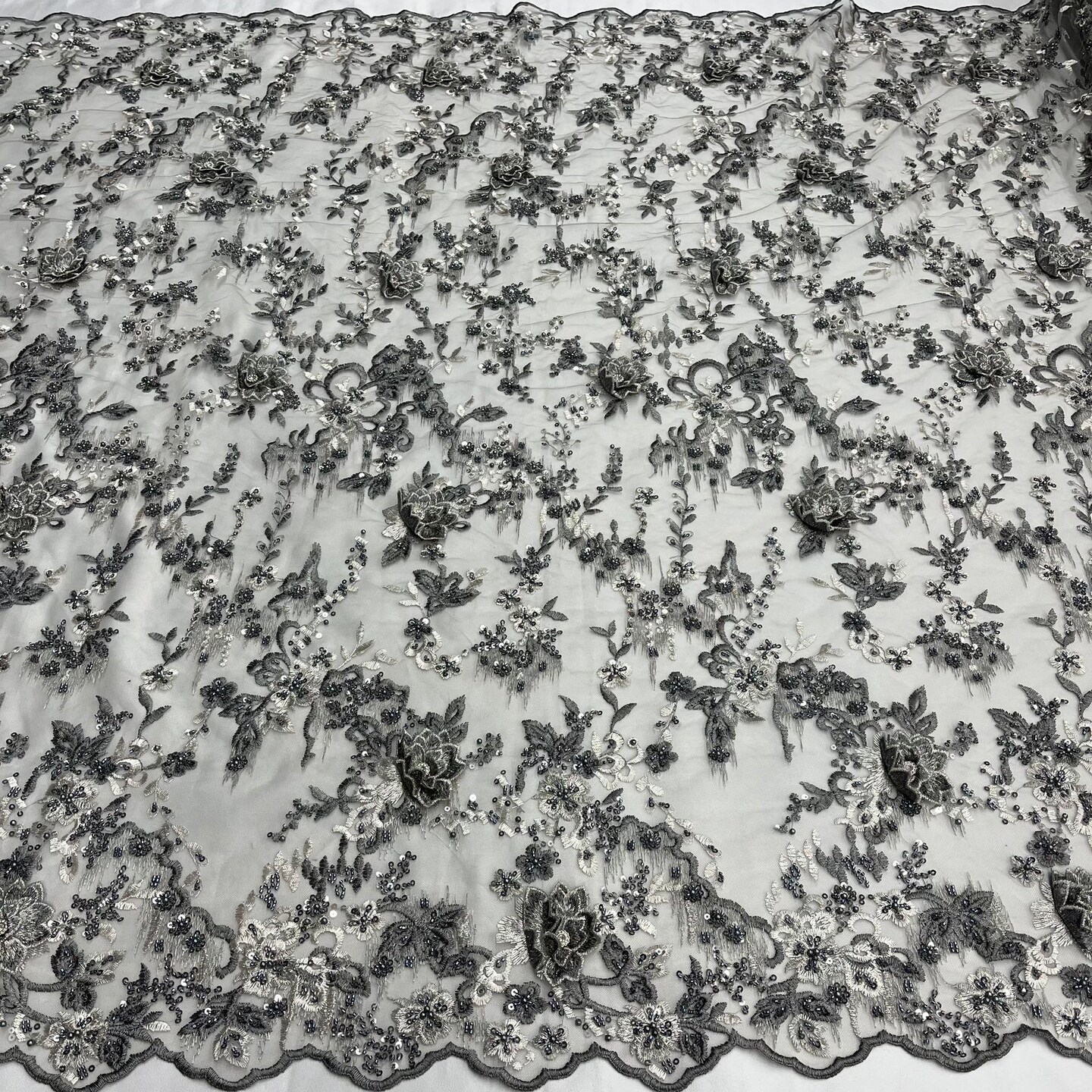 1 Yard Beaded Rhinestone 3D Floral Lace Fabric for Bridal Dresses Dance Costumes 50" Width