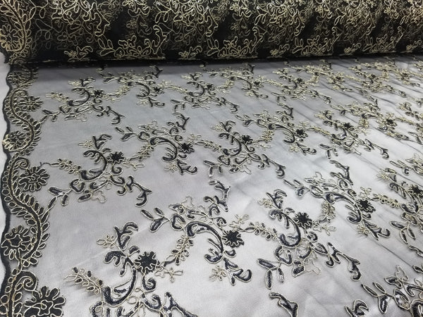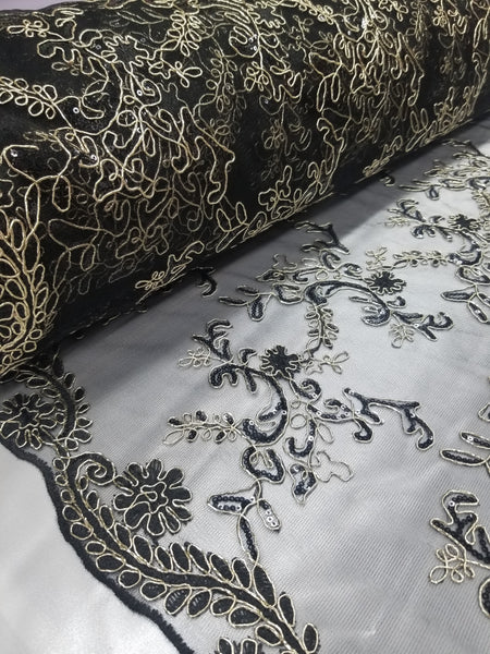 1 Yard Black Champagne Metallic Flowers Sequins Mesh Lace Fabric for Tablecloths and Costumes