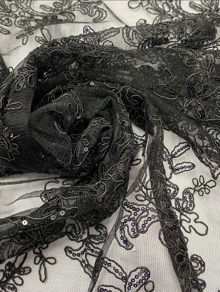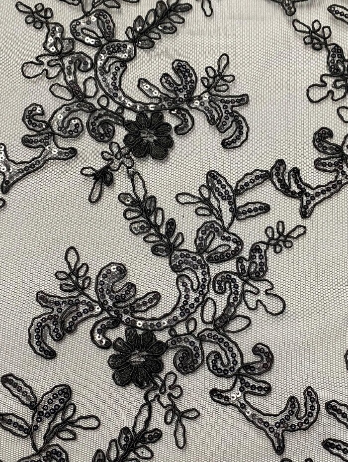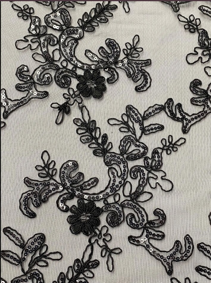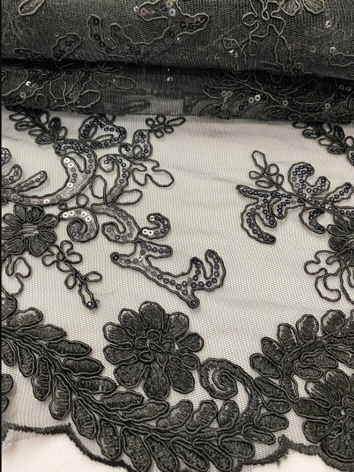 1 Yard Black Corded Mesh Embroidered Lace Fabric with Sequins Double Scallop Edge, 54” Wide