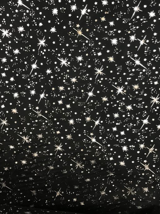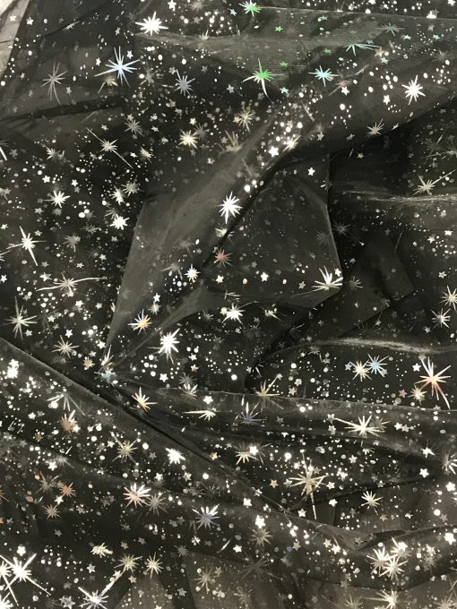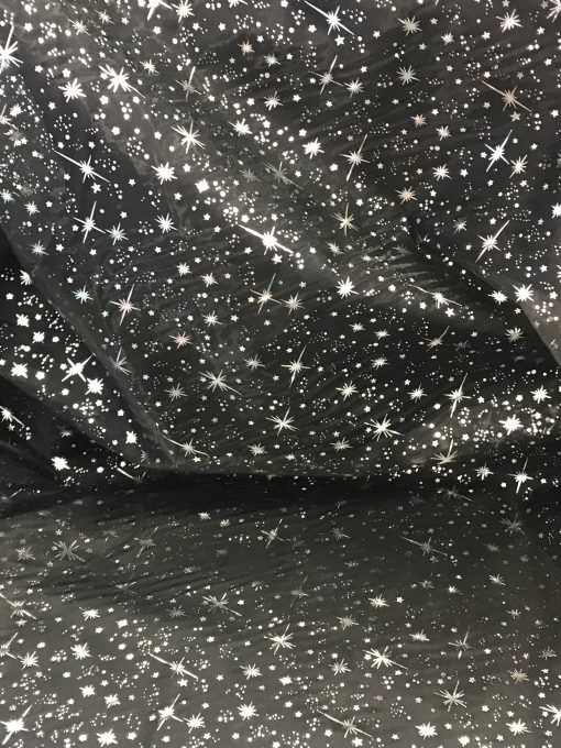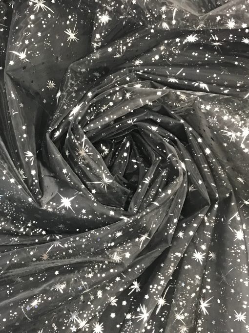 1 Yard Black Organza with Silver Foil Stars Sheer Polyester Fabric for Costumes, Decor, and Crafts 58/60″ Wide