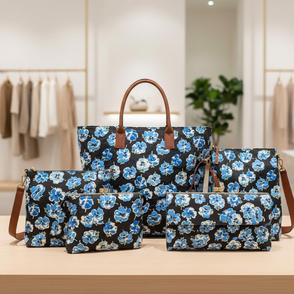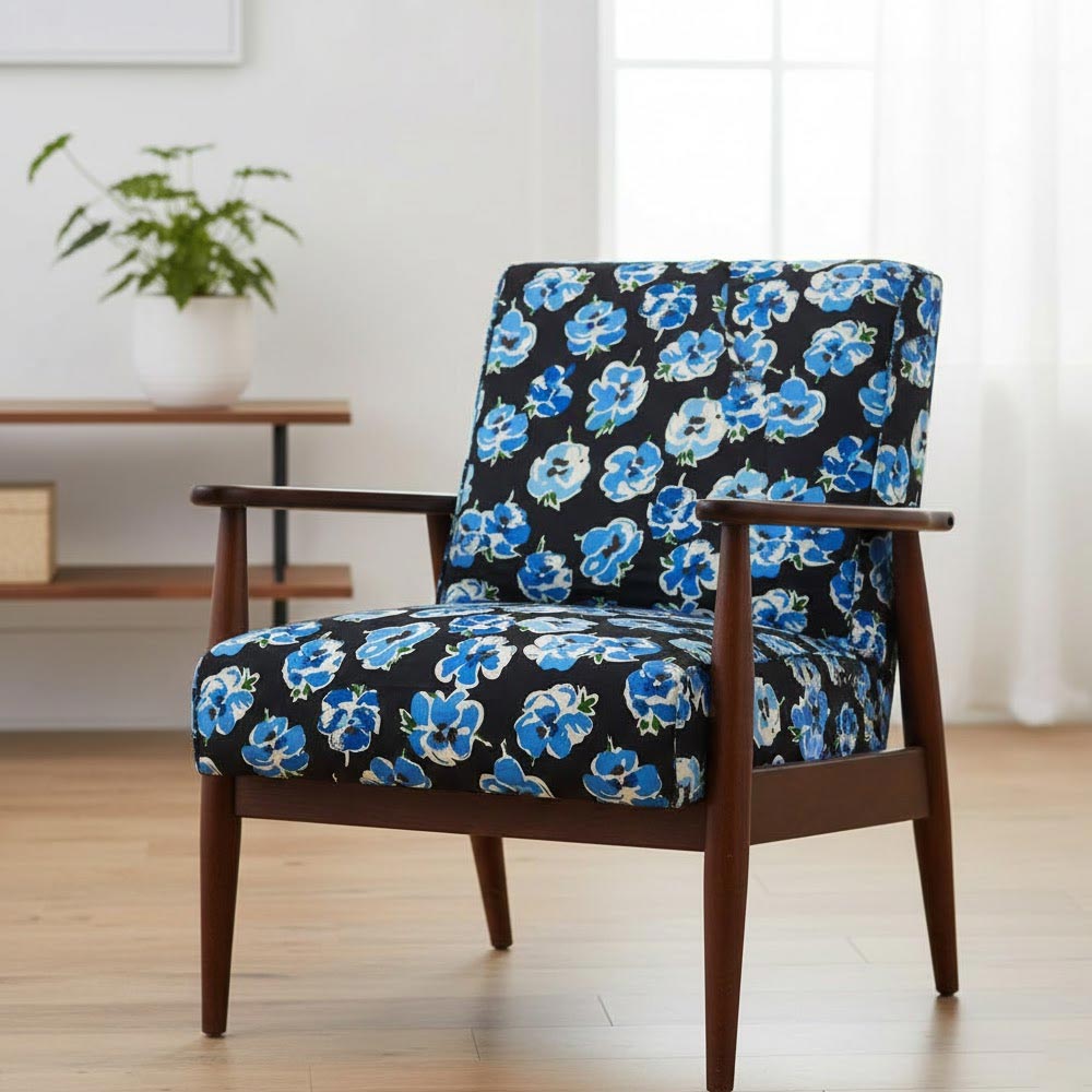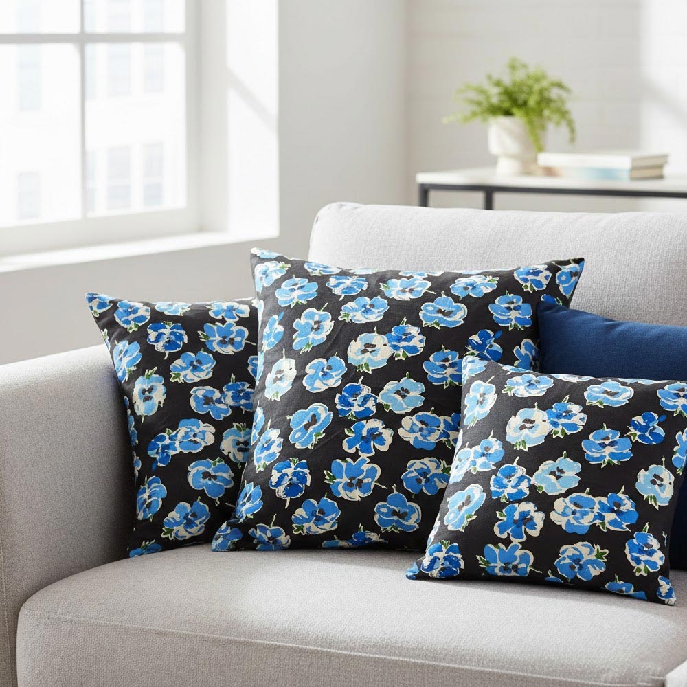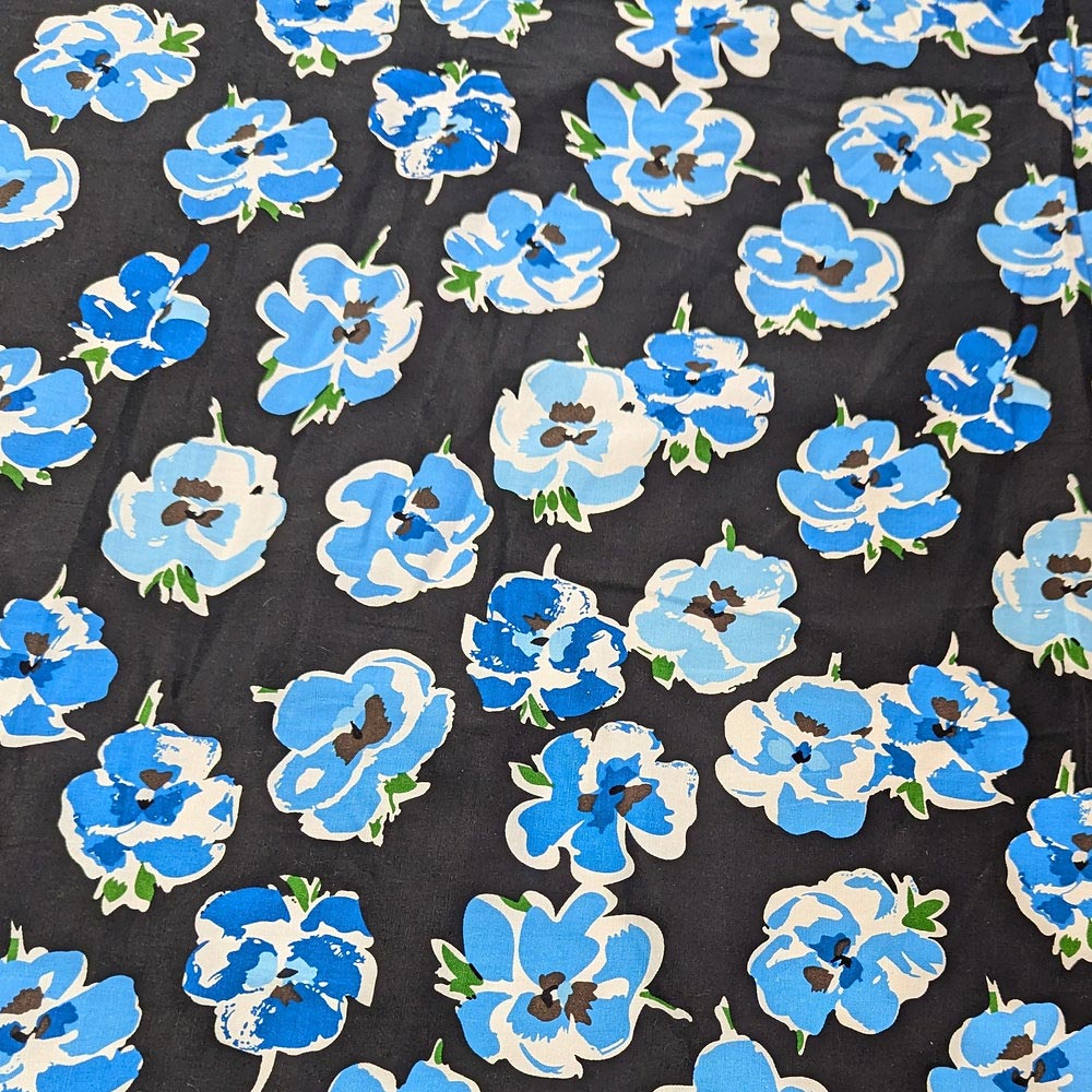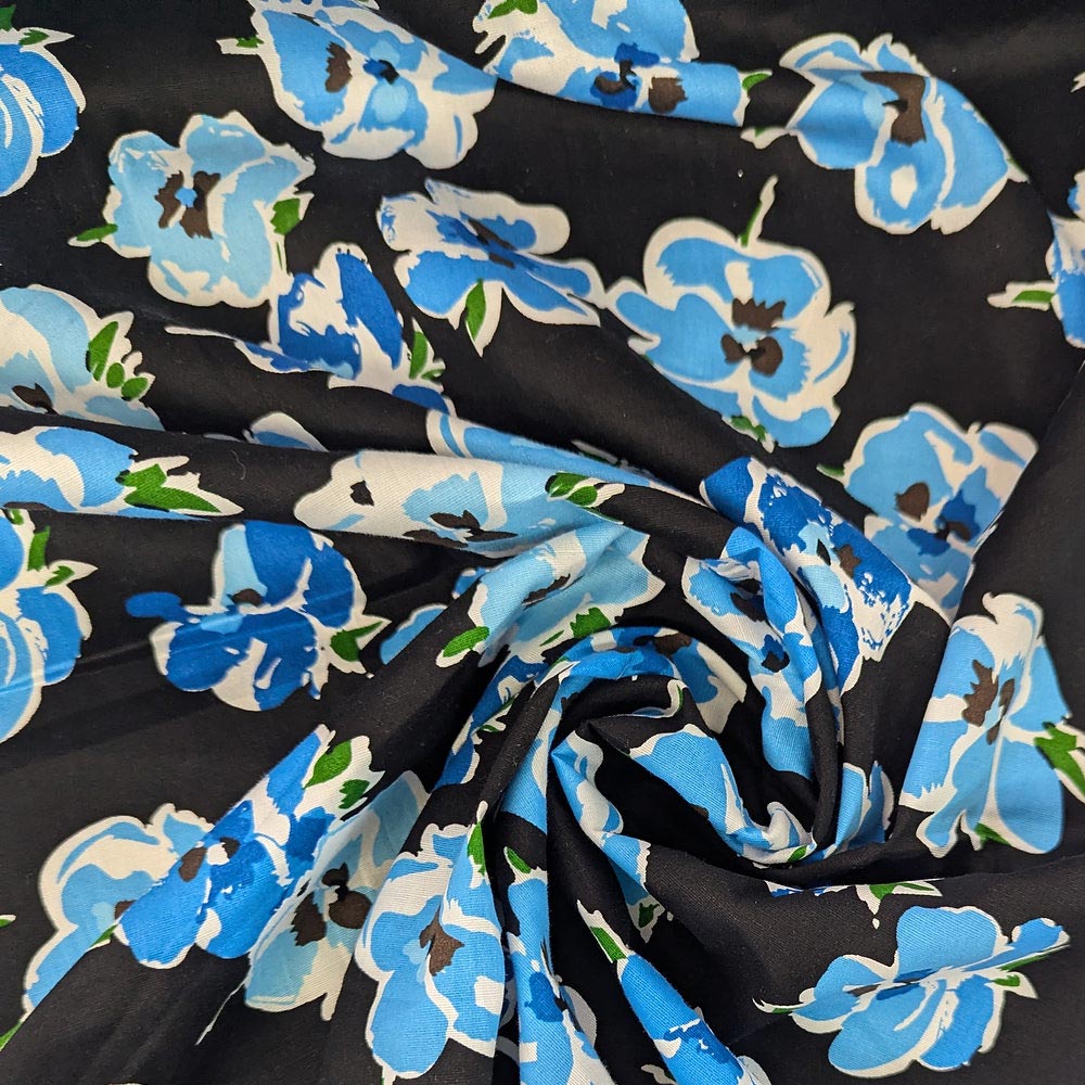 1 Yard Blue Floral 97% cotton and 3% spandex fabric Stretch Print Black Background 46/47 inch Width