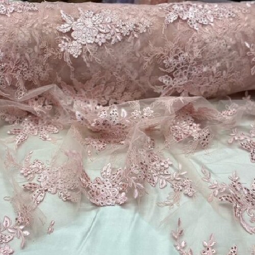 1 Yard Blush Sequin Lace Fabric 100% Polyester Embroidered Mesh with Scalloped Edges for Special Occasion
