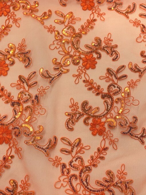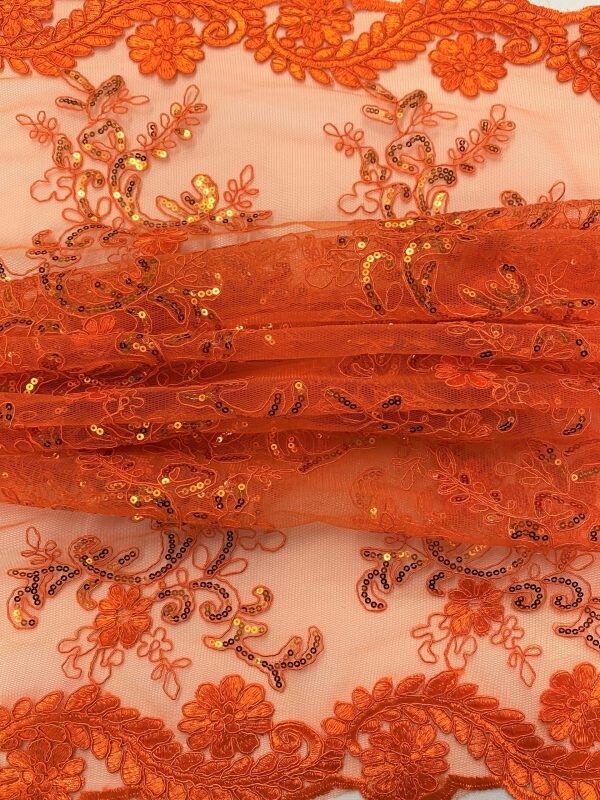 1 Yard Bright Orange Sequin Embroidered Corded Lace Mesh Fabric with Scallop Edges 54” Wide