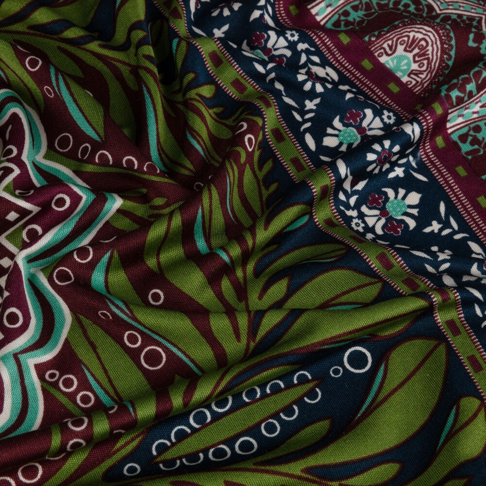 1 Yard Burgundy Green Navy Palm Leaf Mandalas and Classical Stripe Border Silk Jersey 44" Wide