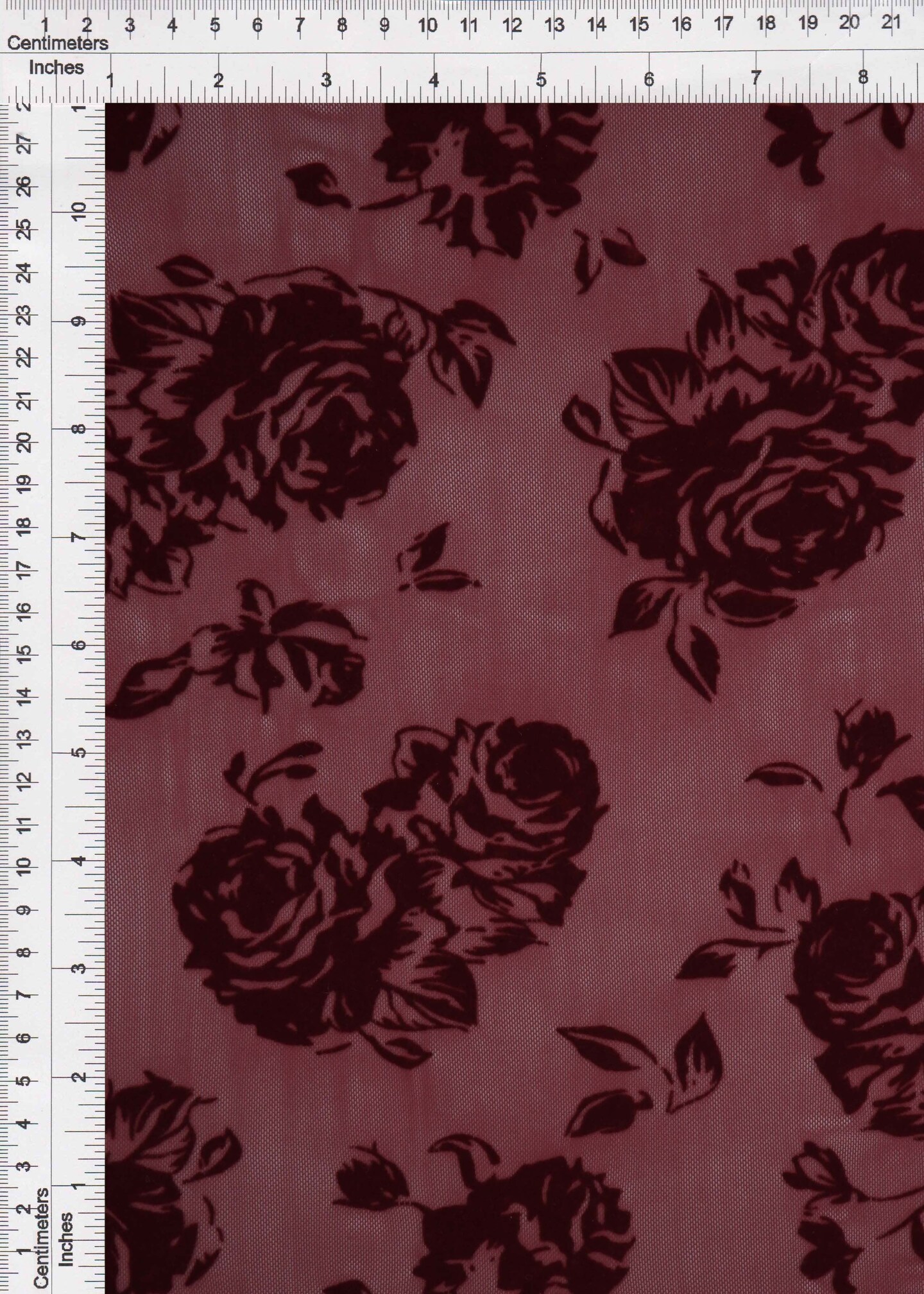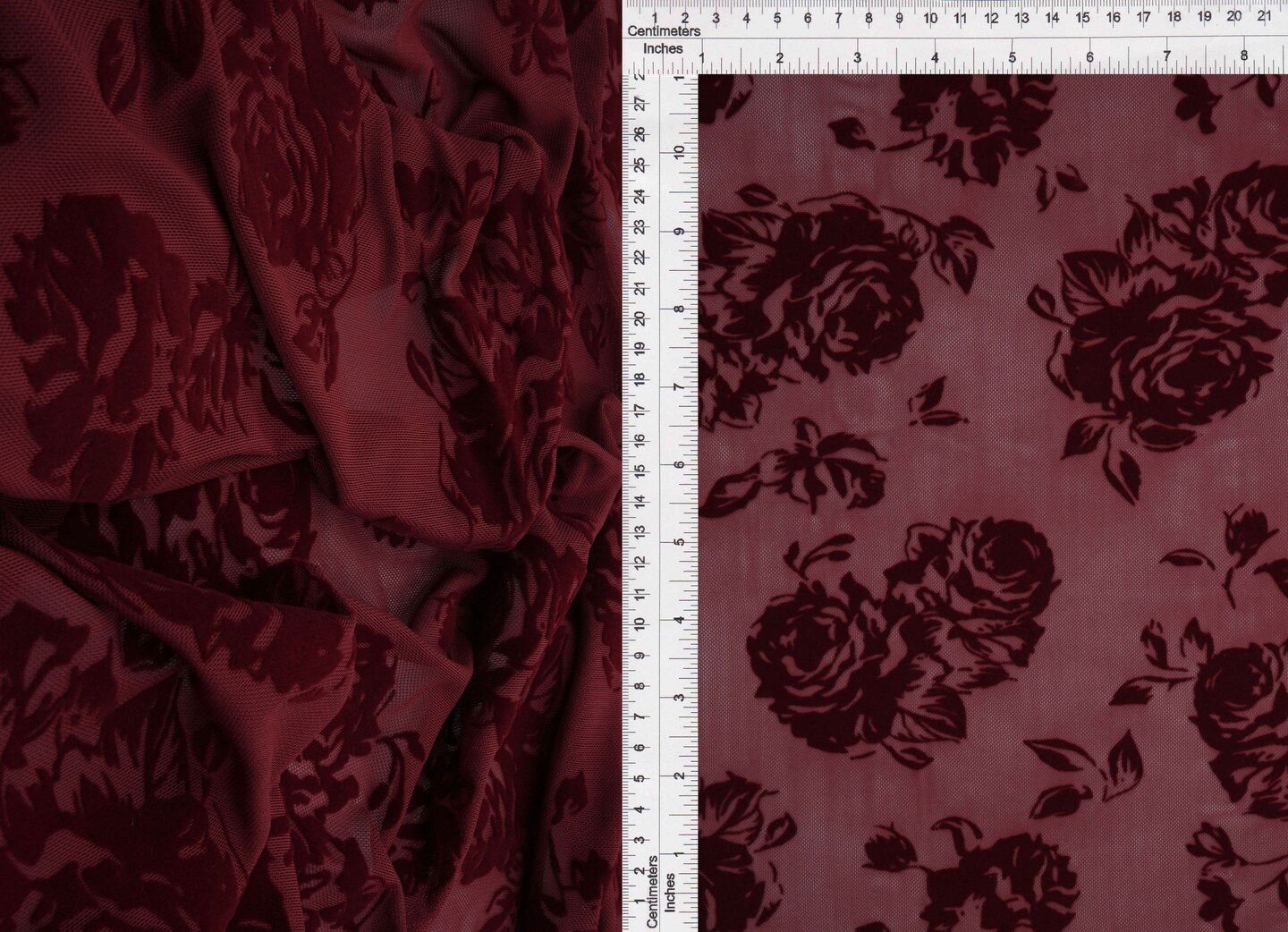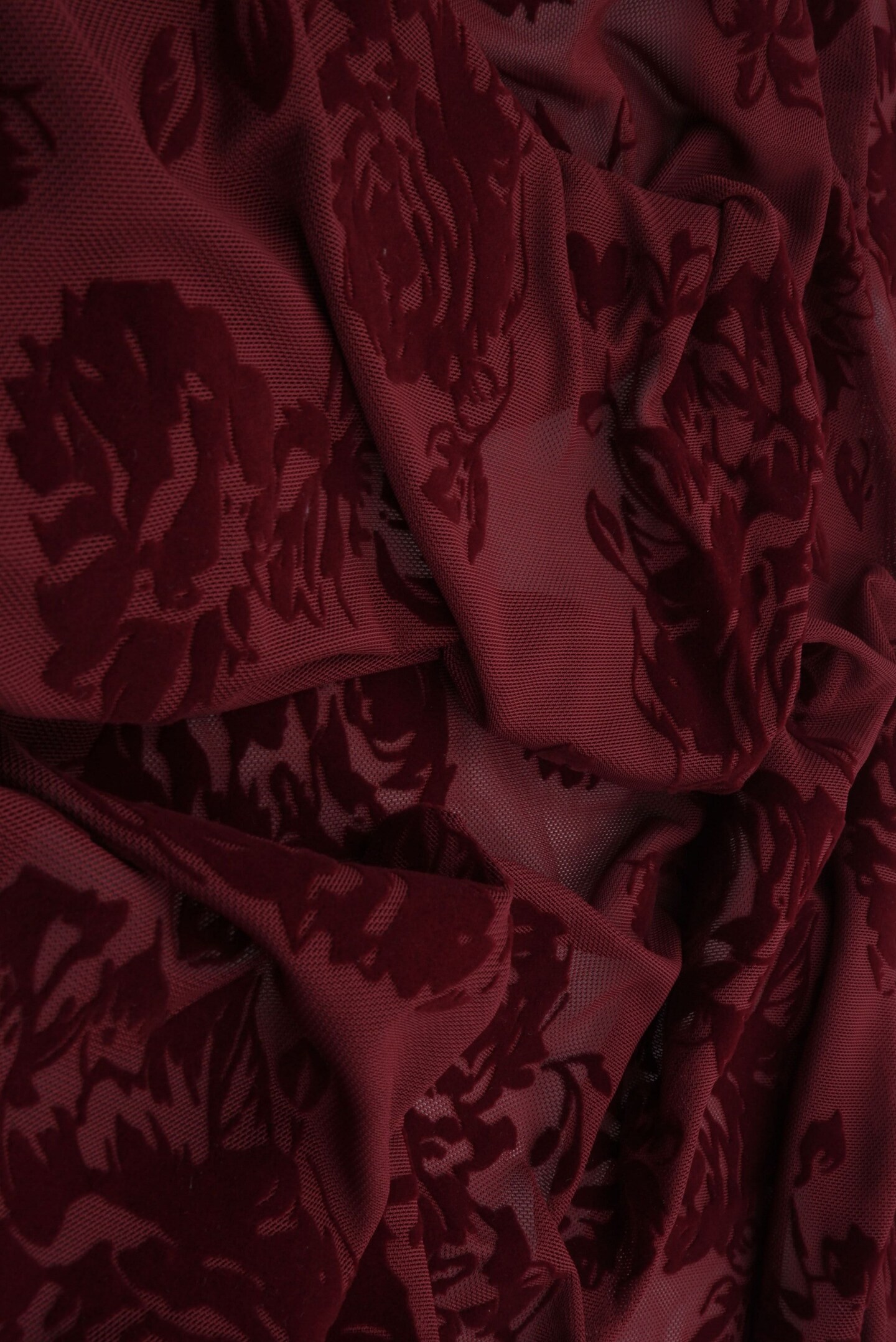1 Yard Burgundy Mesh Floral Flocking Fabric, 56/57″ Wide Polyester Spandex Blend