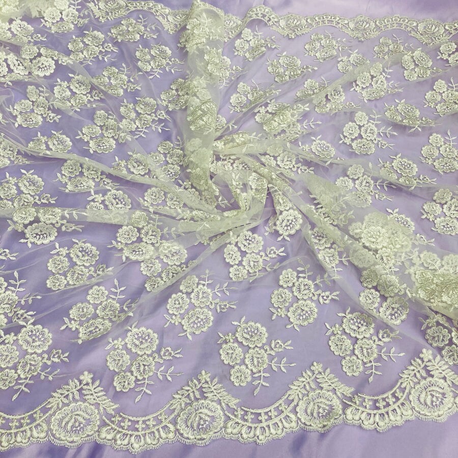 1 Yard - Corded Bridal Lace Fabric Embroidered on 100% Polyester Net Mesh 50 Inches Width