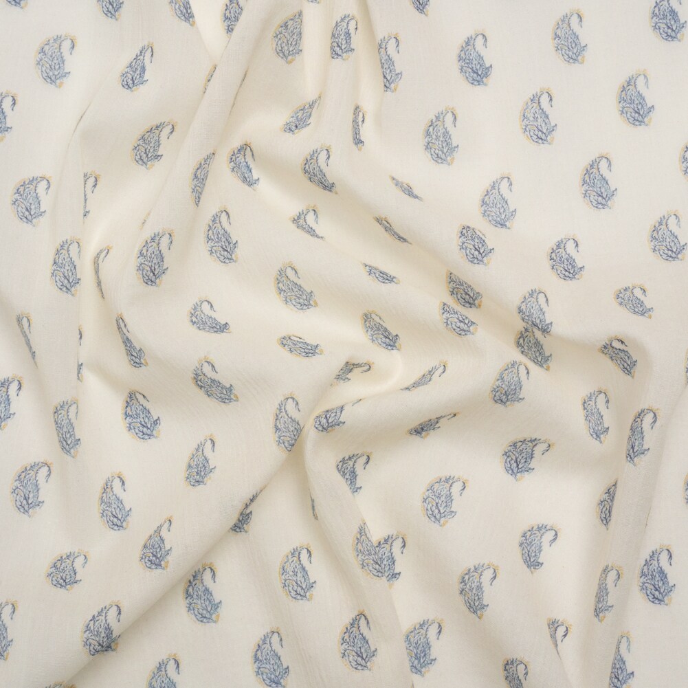 1 Yard Cream Blue Paisley Crinkled Cotton Gauzy Woven Lightweight Fabric For Apparel