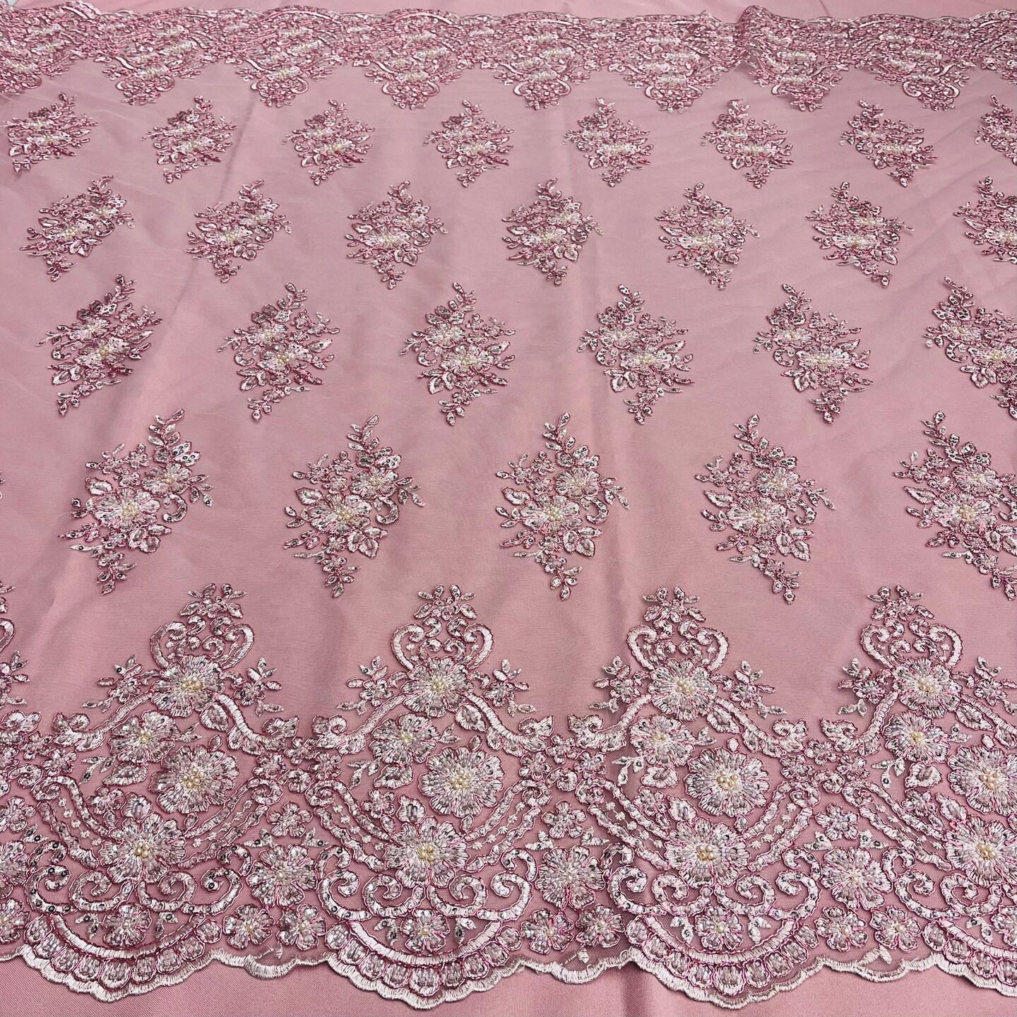 1 Yard Dusty Rose Beaded Corded Lace Fabric with Scallops Embroidered on 100% Poly Metallic 54 Inch Wide