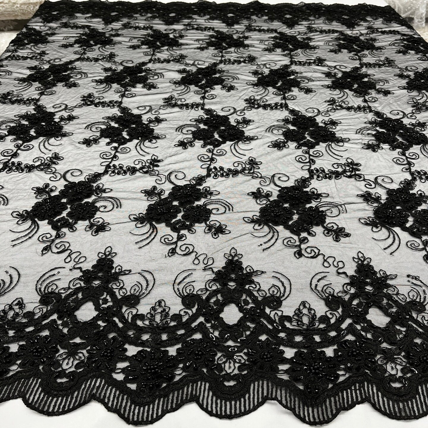 1 Yard Elegant Beaded and Corded Bridal Lace Fabric Embroidered on 100% Polyester Net Mesh 51" Width